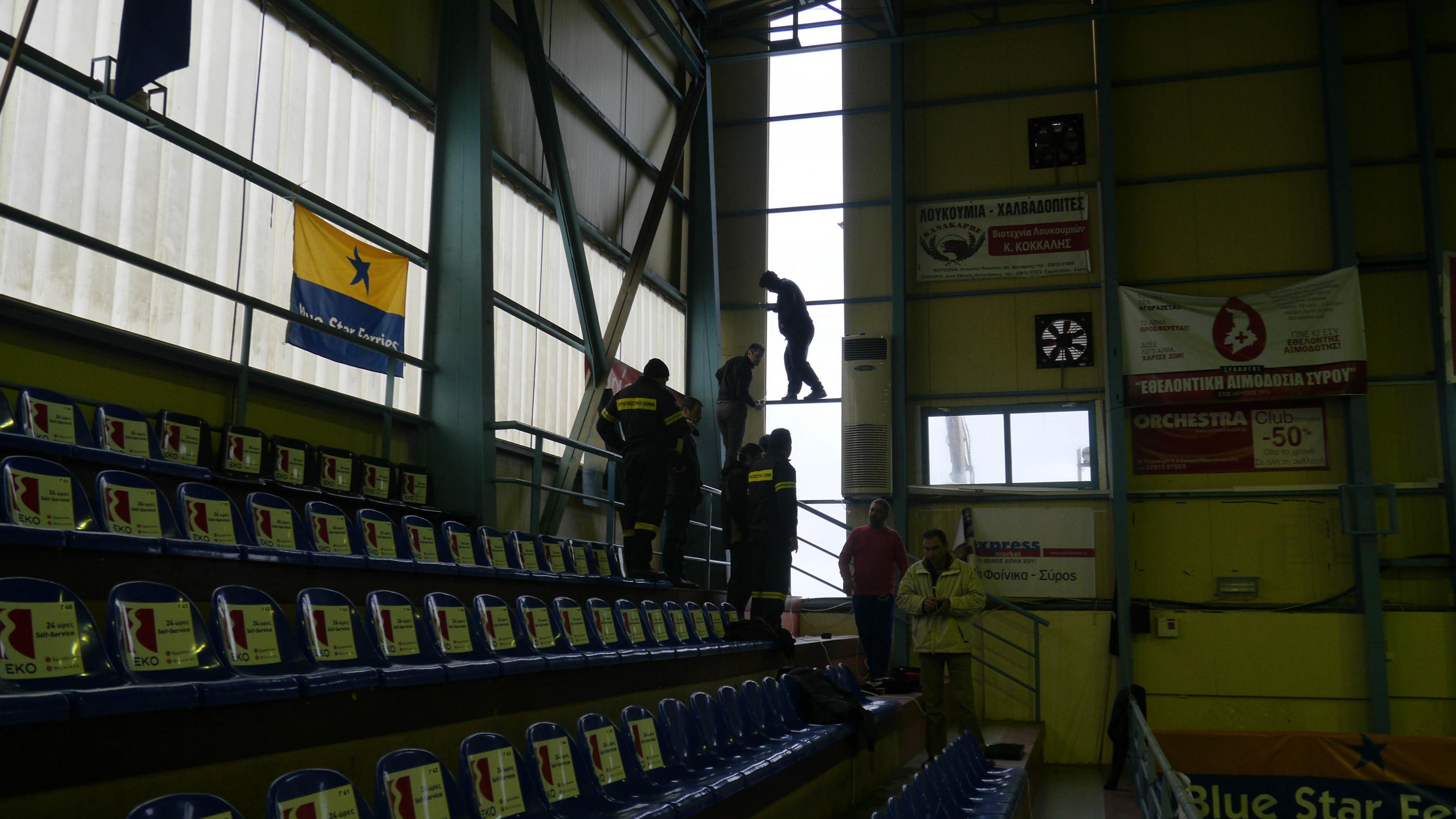 «Δυστυχώς οι έντονες κακές καιρικές συνθήκες που επικρατούν στην Σύρο τις τελευταίες ημέρες έφεραν αυτά τα προβλήματα. Αποκολλήθηκε ένα κομμάτι πάνελ από τον πίσω τοίχο της Β’ κλειστής αίθουσας του αθλητικού κέντρου, αλλά ευτυχώς υπήρξε άμεση αντίδραση από τους υπαλλήλους, που ειδοποίησαν τους αρμόδιους και όλοι μαζί προσπαθούμε να περιορίσουμε τη ζημιά. Το καλό στην προσπάθειά μας ήταν ότι είχαμε και κάποιους ιδιώτες, όπως τον Λεονάρδο Ρούσσο (Ζάναρο). Όπως είδαμε εκτός από το πάνελ που αποκολλήθηκε υπήρχαν κι άλλα μέρη που είχαν πρόβλημα και από την πλευρά μας προσπαθήσαμε να τα συγκρατήσουμε. Ευτυχώς σ’ αυτό το κομμάτι τα καταφέραμε και το πρόβλημα είναι αντιμετωπίσιμο. Από την Τετάρτη ο καιρός δείχνει ότι βελτιώνεται έτσι οι εργασίες θα συνεχιστούν ώστε να αποκατασταθεί πλήρως η ζημιά».