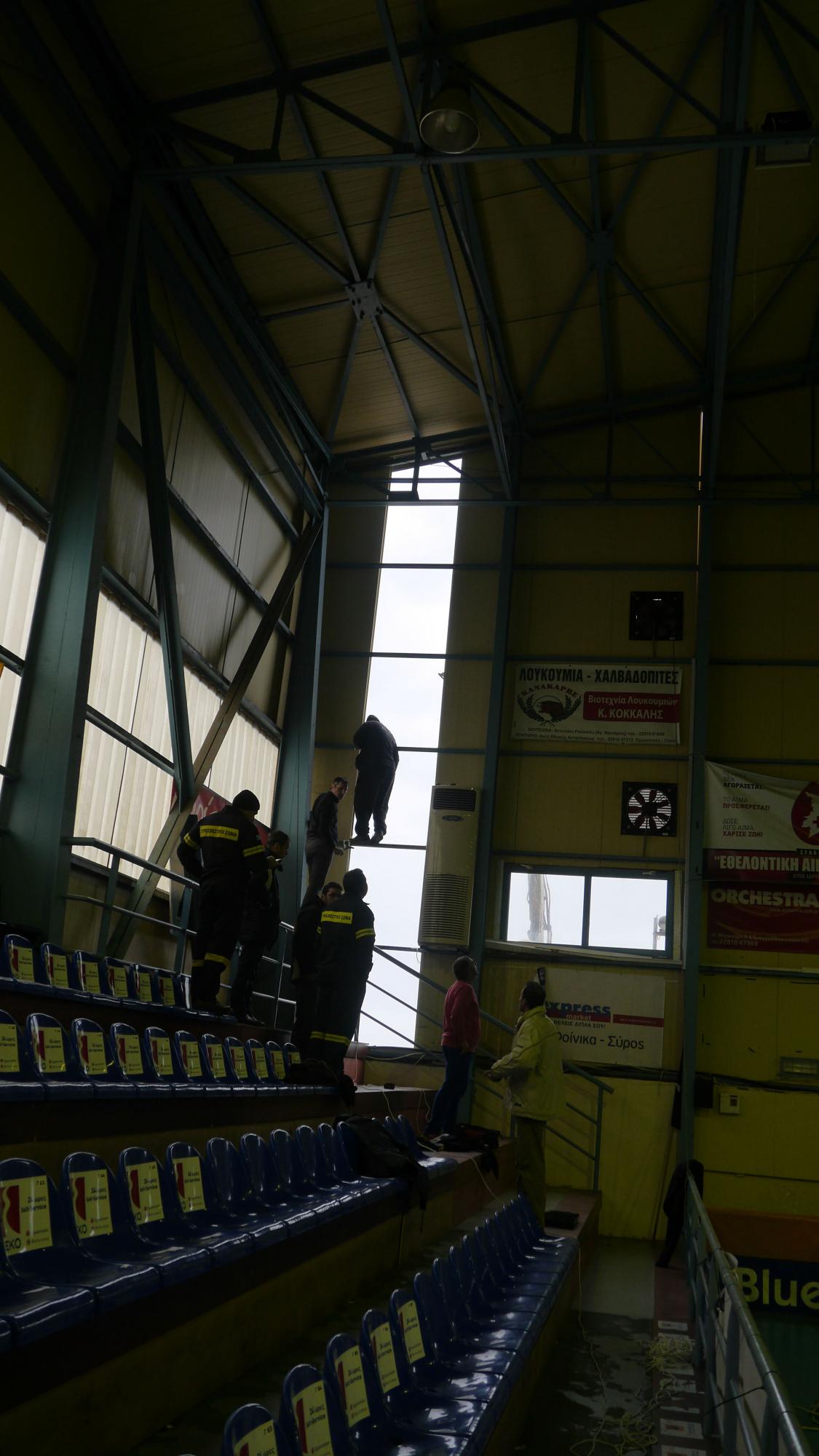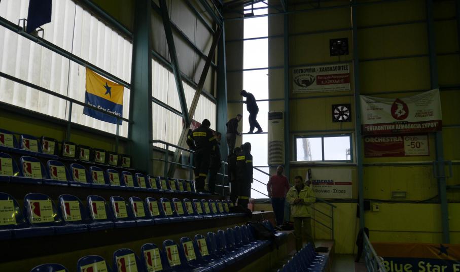 Οι δυνατοί άνεμοι που έπνεαν κατά την χθεσινή ημέρα, πέραν των μικρότερης έκτασης προβλημάτων που παρατηρήθηκαν προκάλεσαν στη Σύρο και ένα σημαντικότερο πρόβλημα, όταν στην πίσω πλευρά του κτιρίου της Β’ κλειστής αίθουσας του Αθλητικού Κέντρου, αποκολλήθηκε τμήμα από τα πάνελ από τα οποία είναι κατασκευασμένη.