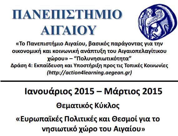 Το Πανεπιστήμιο Αιγαίου στο πλαίσιο του έργου «Το Πανεπιστήμιο Αιγαίου, βασικός παράγοντας για την οικονομική και κοινωνική ανάπτυξη του Αιγαιοπελαγίτικου χώρου – “Πολυνησιωτικότητα”» μέσω της Δράσης 4: «Εκπαίδευση και Υποστήριξη στις τοπικές κοινωνίες» διοργανώνει Θεματικό Κύκλο Επιμορφωτικών Προγραμμάτων με θέμα «Ευρωπαϊκές Πολιτικές και Θεσμοί για το νησιωτικό χώρο του Αιγαίου».