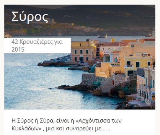 Μετά τα πρώτα ταξίδια της Louis Cruises στο λιμάνι της Σύρου, φέτος προτείνεται μία σειρά από πακέτα που καθιστούν έναν ιδιαίτερο και ξεχωριστό προορισμό την πρωτεύουσα των Κυκλάδων, αφού δεδομένες πρέπει να θεωρούνται 42 αφίξεις για το 2015, όπως ανακοινώνεται στην ιστοσελίδα της εταιρείας. Μεταξύ οκτώ προτάσεων, οι λάτρεις της κρουαζιέρας καλούνται να επιλέξουν τη θαλάσσια διαδρομή που τους ταιριάζει και να πραγματοποιήσουν ένα ταξίδι 3 ή 7 ημερών με ενδιάμεσο σταθμό τη Σύρο. Άξιο αναφοράς είναι το γεγονός πως η Celestyal Cruises στην αναφορά της για το νησί, παρουσιάζει ακόμη και τα αξιοθέατα που μπορεί να επισκεφθεί ένας επισκέπτης από τη στιγμή της αποβίβασής του και μετά, με την Ερμούπολη ιδιαίτερα και πολλά από τα κτίριά της, να κατέχουν τον πρώτο λόγο. Εντάσσοντας την πρωτεύουσα των Κυκλάδων στο πλαίσιο της ειδυλλιακής αλλά και της προσκυνηματικής κρουαζιέρας, μεταξύ άλλων, απόσπασμα του κειμένου παρουσίασης αναφέρει, “Ο Τουρισμός, η Αγροτική Παραγωγή και η Ναυπήγηση αποτελούν επίσης φωτεινά παραδείγματα προόδου, συνολικά, της Σύρου στα χρόνια της νεώτερης ιστορίας της. Εδώ θα συναντήσετε πολυάριθμους καθολικούς ναούς, ξωκλήσια και σημαντικές εκκλησίες, όπως είναι η Μεταμόρφωση του Σωτήρος (εδώ εδρεύει και η Ιερά Μητρόπολη Σύρου), η Κοίμηση της Θεοτόκου (θα θαυμάσετε έργο του Δομήνικου Θεοτοκόπουλου) και ο Άγιος Νικόλαος, πολιούχος της Ερμούπολης. Ολοζώντανο νησί, πανέμορφο, φωτεινό και με κτίσματα αρχιτεκτονικού ενδιαφέροντος, διαθέτει αέναη κίνηση όλες τις ώρες της ημέρας και συγκεντρώνει κόσμο κάθε ηλικίας. Η Σύρος έχει το ορεινό της κομμάτι στον Βορρά, όπου δεσπόζει στην Άνω Μεριά ή Άνω Σύρο η καθολική εκκλησία του Αγίου Γεωργίου που χτίστηκε το Μεσαίωνα και χαρακτηρίζεται από μονοπάτια, γεφύρια και μυστικές ακρογιαλιές αλλά και το πεδινό τμήμα, στον Νότο, με πανέμορφα χωριά και τις γαλαζοπράσινες ακρογιαλιές της”.