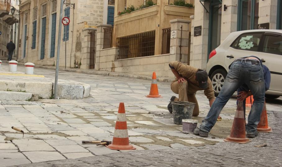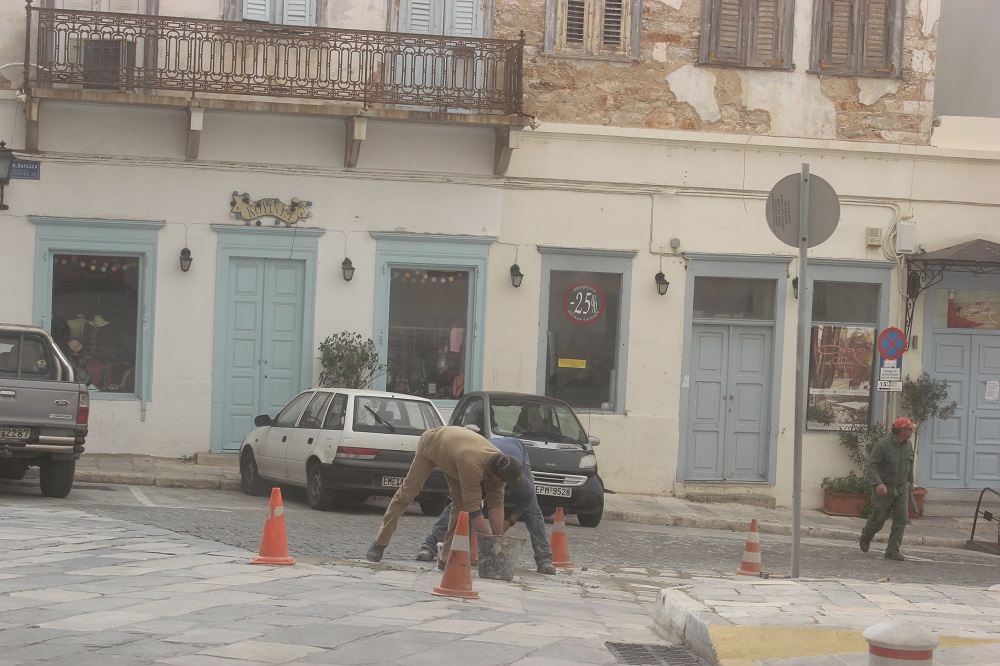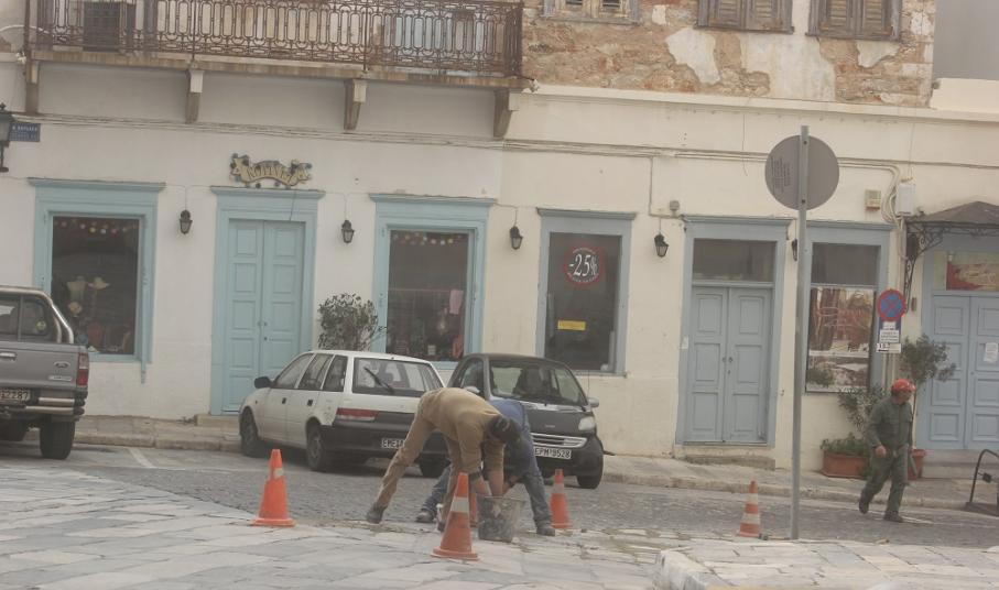 Σε εργασίες ανάπλασης του οδοστρώματος, στον πλακόστρωτο δρόμο επί του Θεάτρου «Απόλλων» της Ερμούπολης, προχώρησαν εργάτες του Δήμου Σύρου – Ερμούπολης, το μεσημέρι της Κυριακής.