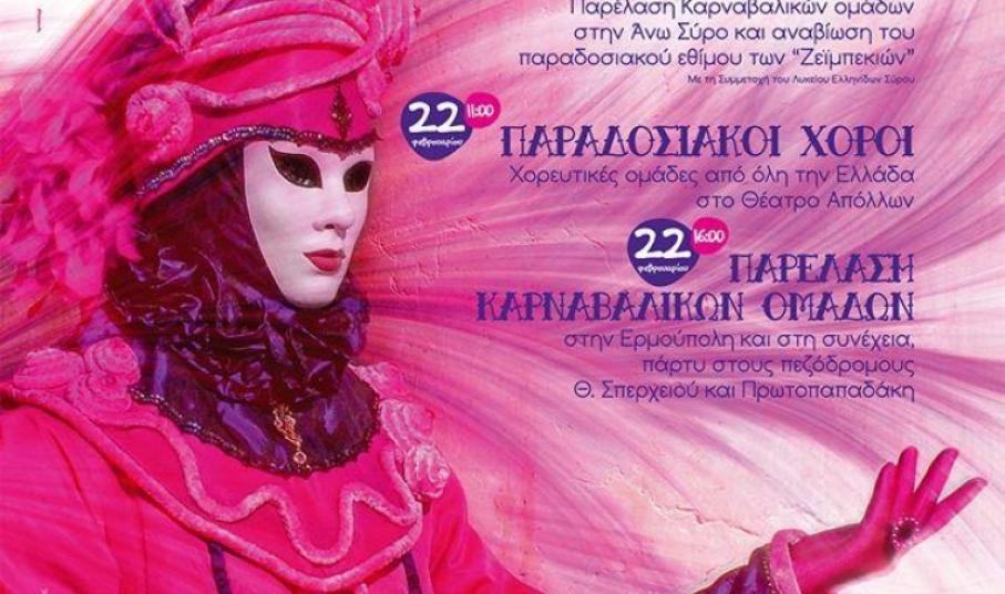 Βασικός κορμός των εκδηλώσεων θα είναι και φέτος, η διπλή παρέλαση των καρναβαλιστών σε Άνω Σύρο και Ερμούπολη. Στις 12 Φεβρουαρίου, πρώτη ημέρα των εκδηλώσεων, θα πραγματοποιηθεί παραδοσιακό τσίκνισμα στην Αγορά της οδού Χίου στην Ερμούπολη με τη συμμετοχή των καταστημάτων της περιοχής και του Πολιτιστικού Συλλόγου Χρούσσων. Την Παρασκευή 20 Φεβρουαρίου, οι Καρναβαλικές ομάδες θα παρουσιάσουν τις στολές τους στην Πινακοθήκη Κυκλάδων. Μία ημέρα μετά οι καρναβαλιστές δίνουν το πρώτο τους ραντεβού στην Άνω Σύρου, όπου θα αναβιώσει το παραδοσιακό έθιμο των “Ζεϊμπεκιών” με τη συμμετοχή του Λυκείου Ελληνίδων Σύρου. Οι αποκριάτικες εκδηλώσεις κορυφώνονται την Κυριακή 22 Φεβρουαρίου με την παρουσίαση παραδοσιακών χορών στο Θέατρο Απόλλων από χορευτικές ομάδες από όλη την Ελλάδα και φυσικά, τη μεγάλη παρέλαση των καρναβαλικών ομάδων στην Ερμούπολη. Σημειώνεται ότι για πρώτη φορά, η παρέλαση της Ερμούπολης θα έχει ως αφετηρία την οδό Νεωρίου, πίσω από το ΙΚΑ Σύρου. Η βραδιά θα ολοκληρωθεί με το καθιερωμένο πάρτι στους πεζόδρομους της Θυμάτων Σπερχειού και Πρωτοπαπαδάκη. Την Καθαρά Δευτέρα γιορτάζουμε τα Κούλουμα στις εξοχές της Σύρου και την Τρίτη 24 Φεβρουαρίου επιστρέφουμε στον μεσαιωνικό οικισμό της Άνω Σύρου για την αναβίωση του εθίμου της τελευταίας αποκριάς των Καθολικών από το Λύκειο Ελληνίδων Σύρου με το κάψιμο του Καρνάβαλου.