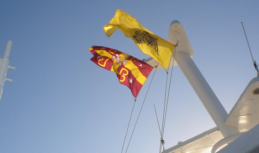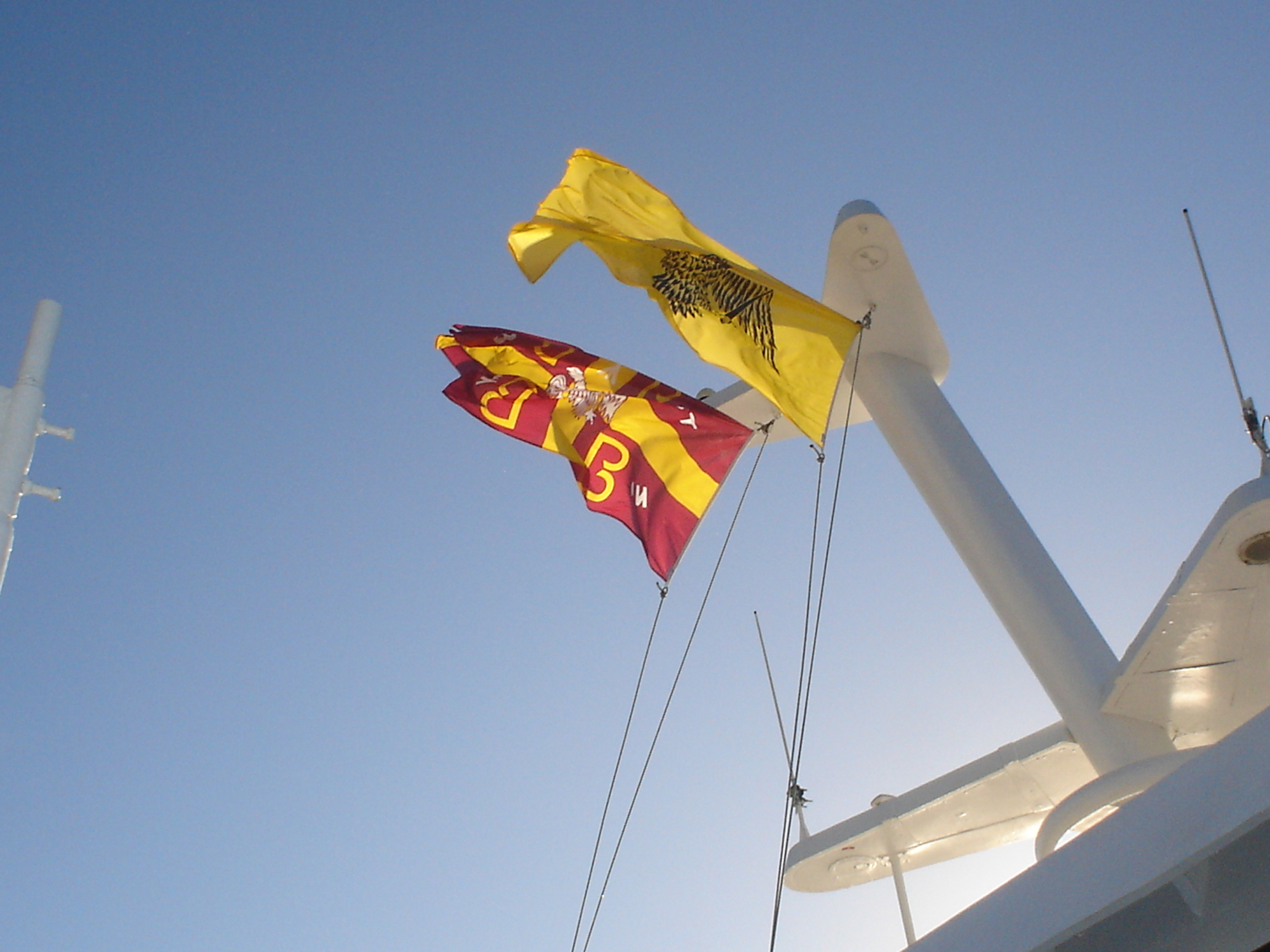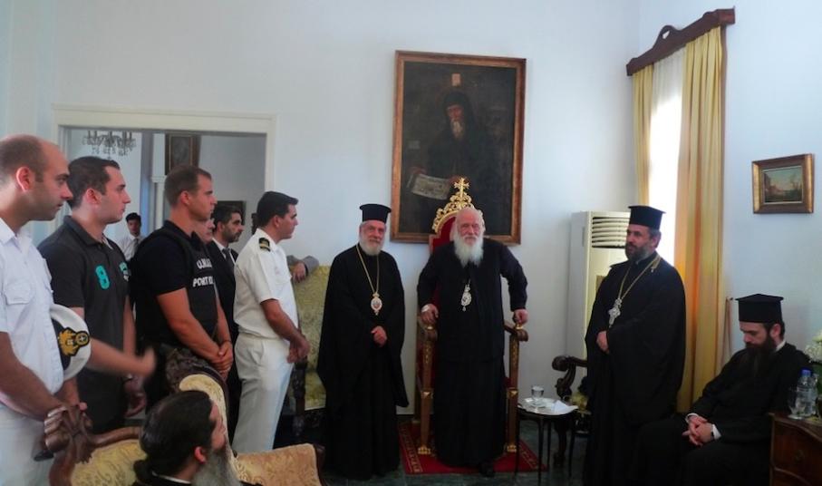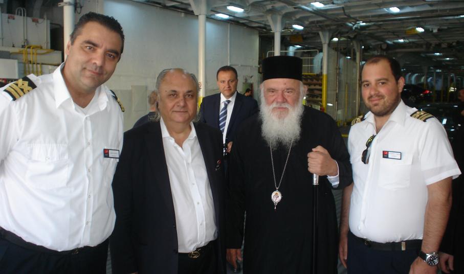 Τον Μακαριώτατο υποδέχθηκαν ο Πλοίαρχος capt. Γεώργιος Δήμου με σύσσωμο το πλήρωμα, ενώ στους ιστούς του πλοίου ανέμιζαν οι σημαίες Β καθώς και η Βυζαντινή.