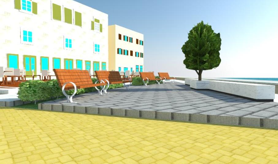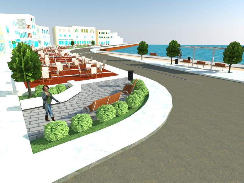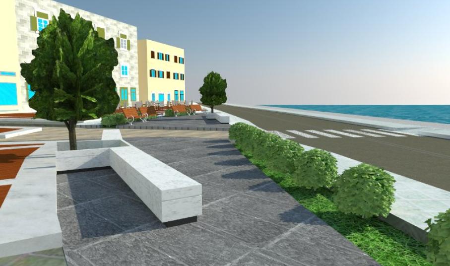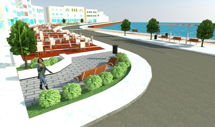 · Η δημιουργία χώρου πλατείας για τη νέα χωροθέτηση των τραπεζοκαθισμάτων των καταστημάτων. Κατά μήκος της πρόσοψης των κτιρίων και όπου αυτό επιτρέπεται από το πλάτος της οδού, γίνεται επέκταση των υφιστάμενων πεζοδρομίων και κατασκευάζονται χώροι πλατείας υπερυψωμένοι κατά 15 εκατοστά, πάνω στους οποίους θα τοποθετηθούν τα τραπεζοκαθίσματα των παρακείμενων καταστημάτων. Η υπερύψωση προτείνεται για τη καλύτερη θέαση προς το θαλάσσιο μέτωπο. Το τμήμα της πλατείας που θα καταλαμβάνει το κάθε κατάστημα, θα είναι συγκεκριμένο και οριοθετημένο. Μεταξύ των τμημάτων αυτών δημιουργούνται “διάδρομοι” για τους διερχόμενους. Ταυτόχρονα προβλέπονται και ελεύθεροι καθιστικοί χώροι με χαμηλές φυτεύσεις. Η σκίαση των τραπεζοκαθισμάτων, θα γίνεται μέσω του στεγάστρου που προτείνεται στην μελέτη, ενώ στα σημεία που δεν είναι δυνατή η τοποθέτησή του, επιτρέπεται να χρησιμοποιούνται ομπρέλες, μόνο λευκού χρώματος από καραβόπανο, χωρίς κανένα σχέδιο ή αναγραφή επωνυμίας διαφημιστικής ή άλλου σκοπού. Δεν θα υπάρχει περιορισμός ως προς τον αριθμό ή το είδος των τραπεζιών και καθισμάτων που θα χρησιμοποιηθούν από κάθε κατάστημα σε κάθε τμήμα που θα τους δοθεί προς χρήση.