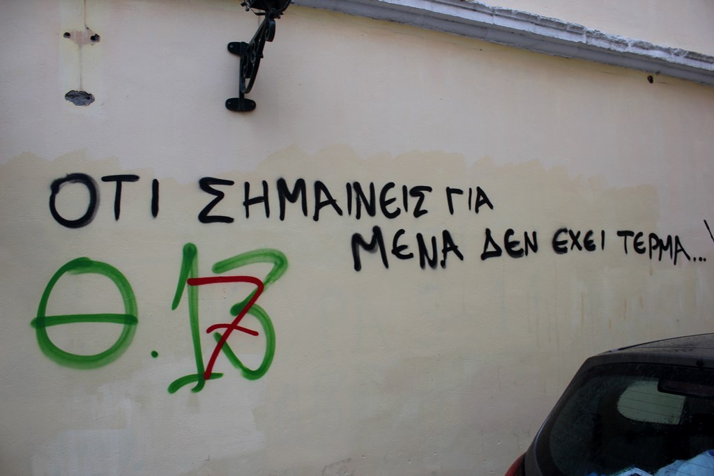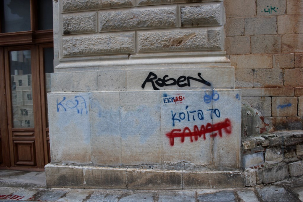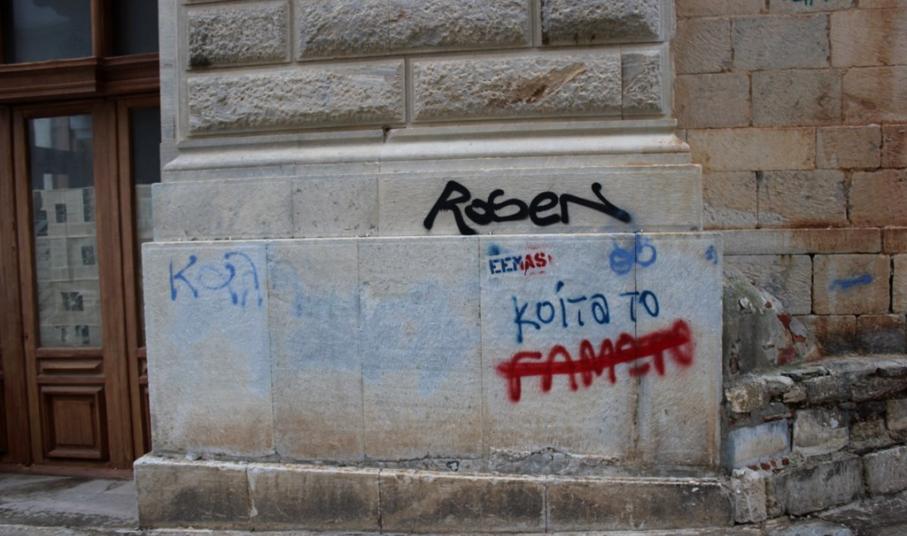 Τα «έργα τέχνης» στους τοίχους των νεοκλασικών αναφέρονται σε πολιτικές ή γηπεδικές προτιμήσεις, σε προσωπικά προβλήματα των «καλλιτεχνών», αλλά τα περισσότερα αποτελούνται από υπογραφές τύπου «tag».