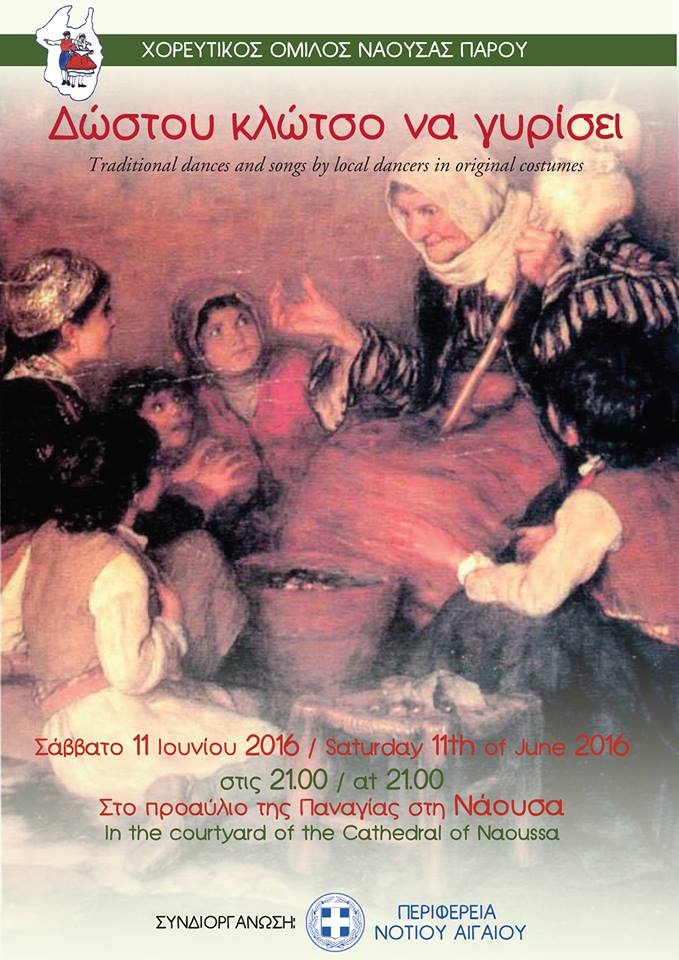Την τελική χορευτική του παράσταση για την περίοδο 2015-2016 με τον τίτλο "Δώστου κλώτσο να γυρίσει" θα παρουσιάσει ο Χορευτικός Όμιλος Νάουσας Πάρου το Σάββατο 11 Ιουνίου 2016 στις 21:00, στο προαύλιο του Ιερού Ναού Κοίμησης Θεοτόκου Νάουσας.