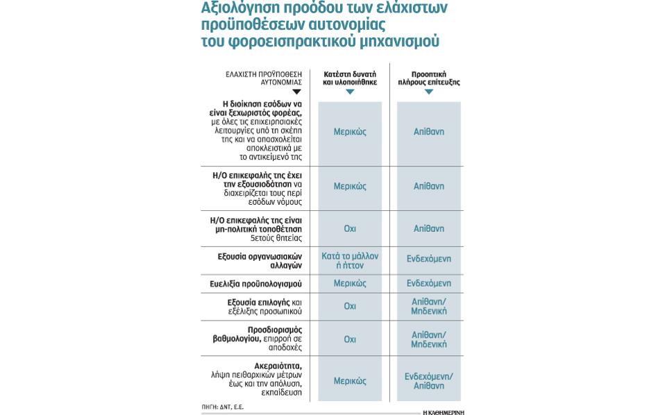 1. Η διοίκηση εσόδων να είναι ξεχωριστός φορέας με όλες τις επιχειρησιακές λειτουργίες. Αυτή η προϋπόθεση απαιτεί να ολοκληρωθούν οι μεταβιβάσεις αρμοδιοτήτων προς τη ΓΓΔΕ, τη θέσπιση της ερευνητικής λειτουργίας, τη διευθέτηση της επικάλυψης με το ΣΔΟΕ και την πλήρη υλοποίηση της νέας οργανωσιακής διάρθρωσης με βάση τις επιτελούμενες λειτουργίες. Η πλήρης επίτευξη της ελάχιστης προϋπόθεσης αυτονομίας κρίνεται απίθανη, δεδομένης της παρούσας έλλειψης πολιτικής βούλησης για να διαμορφώσει, να εξοπλίσει πλήρως και να εξουσιοδοτήσει τη λειτουργία των φορολογικών ερευνών.
