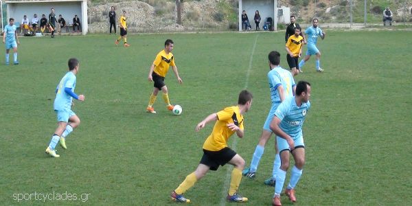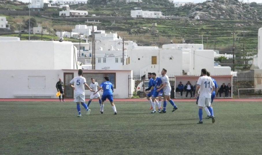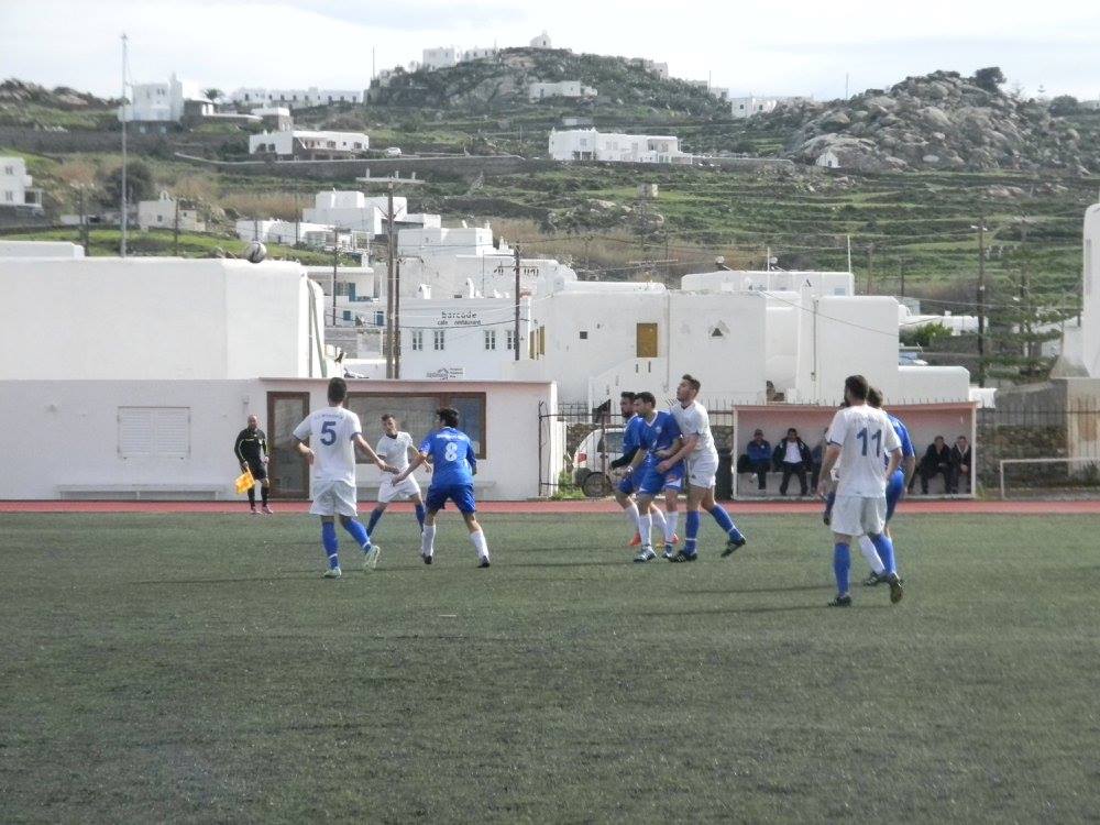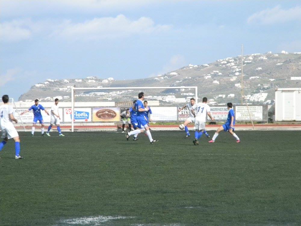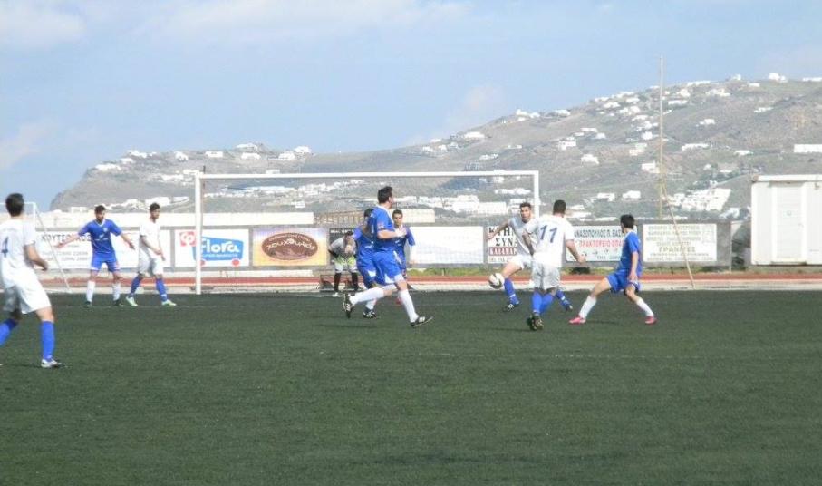 Από την άλλη ο Α.Ο. Μυκόνου είχε τον πλήρη έλεγχο του αγώνα και με τουλάχιστον 65% κατοχή της μπάλας προσπαθούσε να βρει διαδρόμους απέναντι στο "αμυντικό τοίχος" των φιλοξενούμενων.