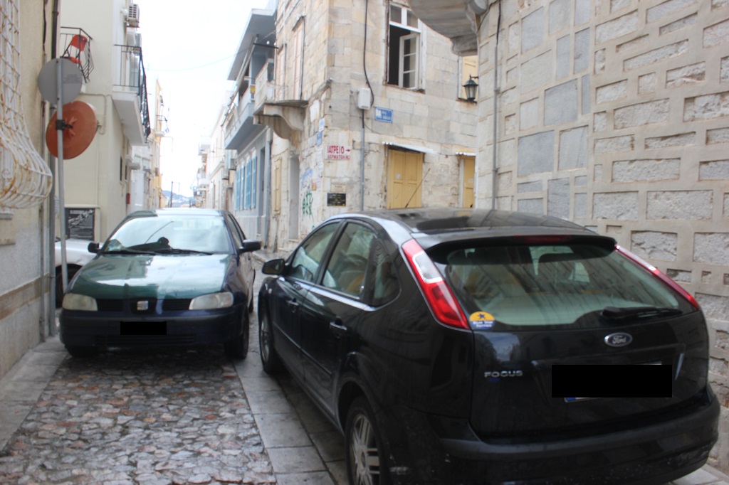 Ακόμη μια φορά, όπως φαίνεται στο φωτογραφικό υλικό, στην περιοχή πίσω από τον Ιερό Ναό Κοιμήσεως της Θεοτόκου της Ερμούπολης, ασυνείδητοι οδηγοί σταθμεύουν τα αυτοκίνητά τους σε μικρές πεζοδρομημένες οδούς, οι οποίες μάλιστα οδηγούν σε σκαλιά – με αποκλειστική, δηλαδή, διέλευση των πεζών.