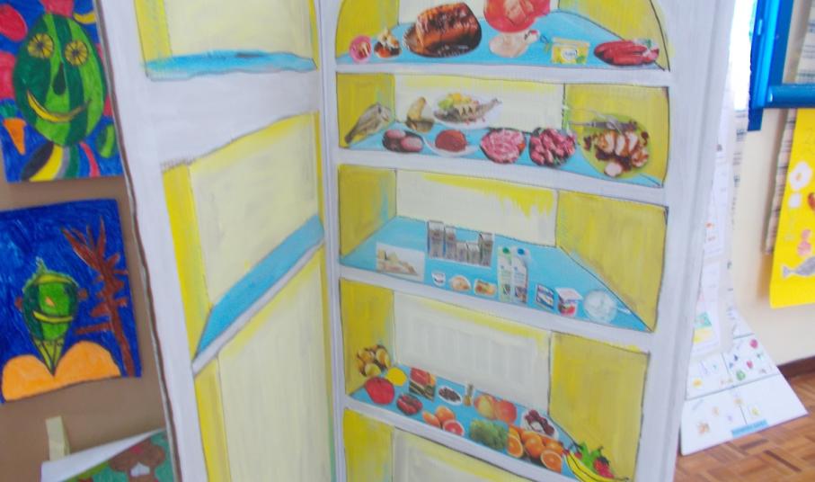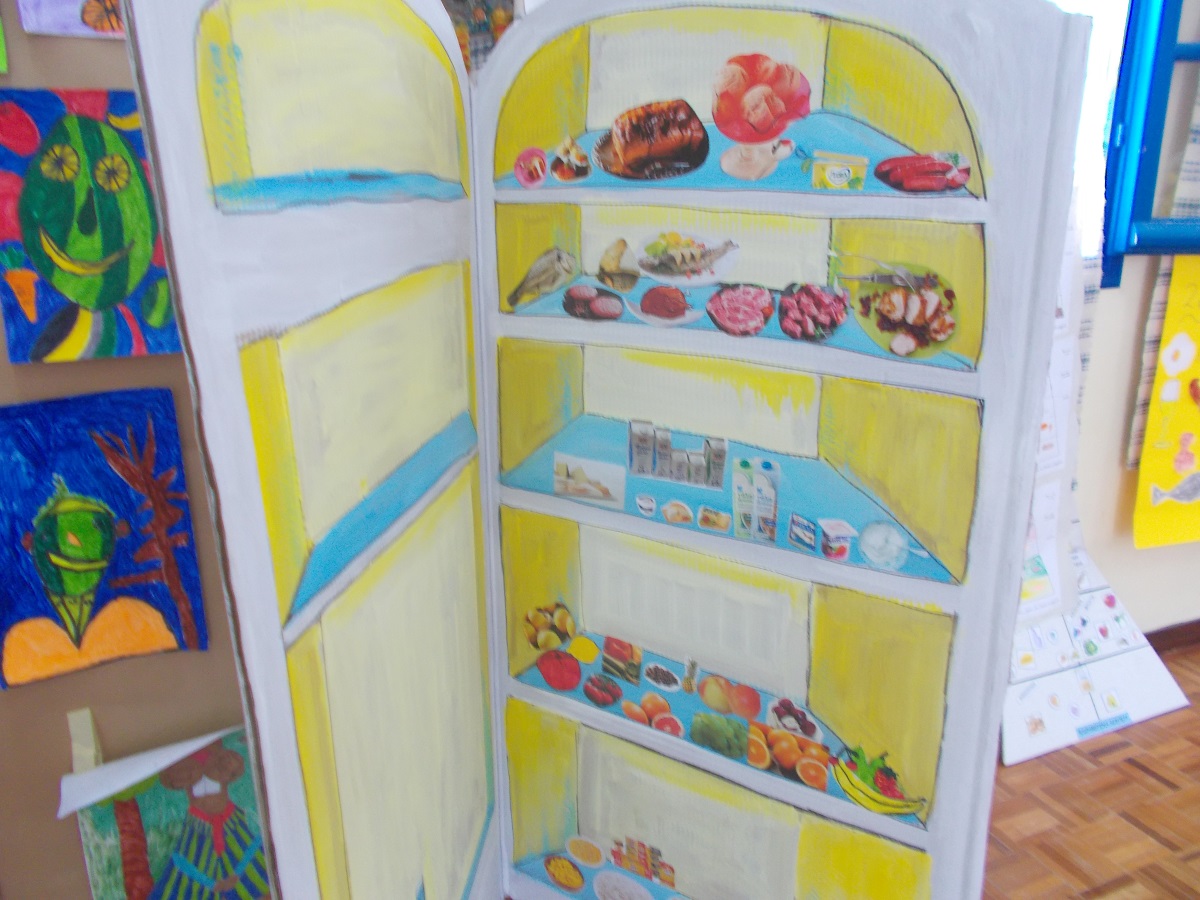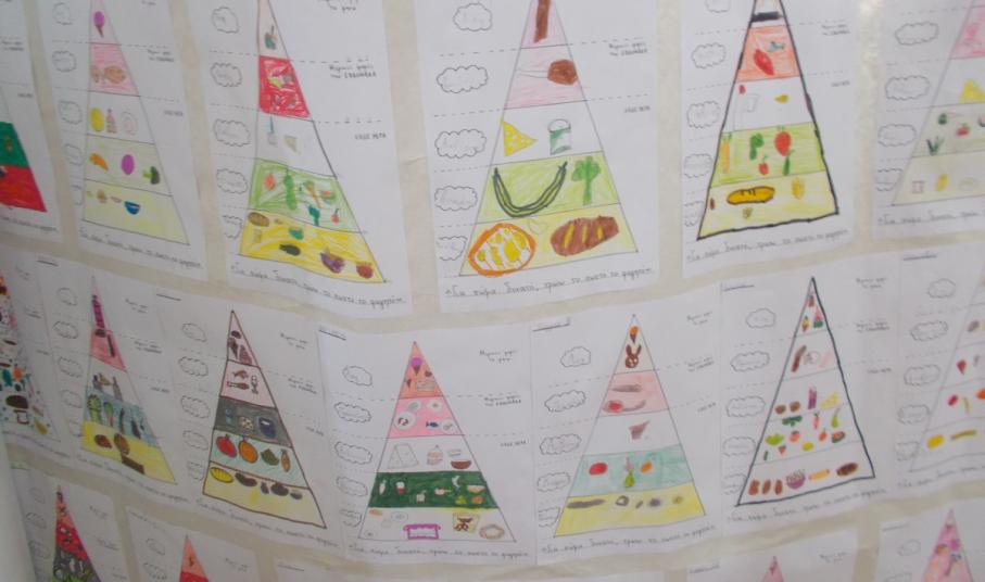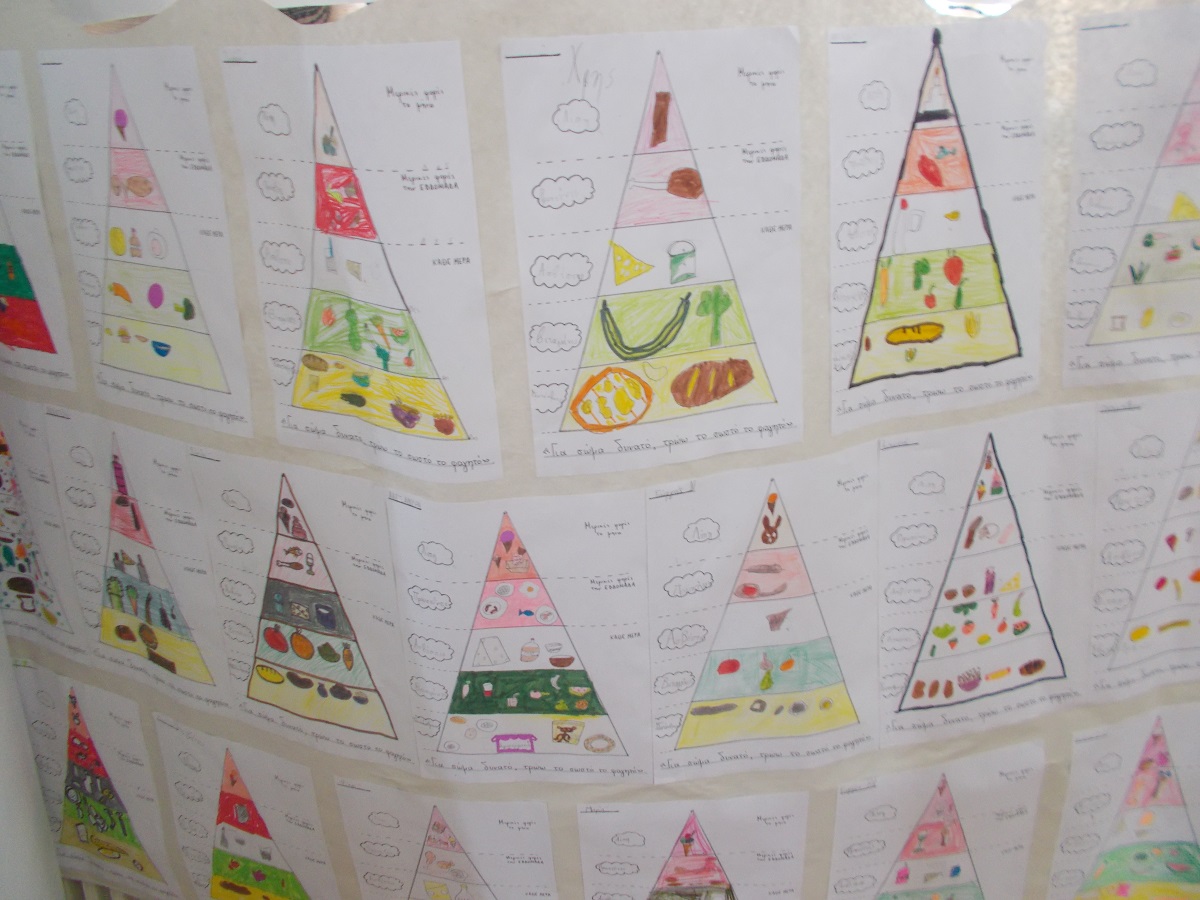 Οι μαθητές της Β’ Τάξης και οι υπεύθυνες εκπαιδευτικοί Λουΐζα Ρούσσου και Γλύκα Τσιρονίκου παρουσίασαν το πρόγραμμα «Για σώμα δυνατό, τρώω το σωστό το φαγητό», που αποσκοπούσε στην ενημέρωση των παιδιών για τις τροφές και την υιοθέτηση υγιεινών τάσεων διατροφής στα γεύματά τους εντός κι εκτός σχολείου. Στο πλαίσιο αυτό, διερευνήθηκαν με σχετικό ερωτηματολόγιο οι συνήθειες διατροφής των παιδιών κατά τη διάρκεια της ημέρας, με στόχο τη βελτίωσή τους στο τέλος του προγράμματος. Μελετήθηκαν τα τρόφιμα ζωικής και φυτικής προέλευσης και αναζητήθηκαν σε σχετική ζωγραφιά. Τα παραμύθια «Ο Αγησίλαγος» και «Μια φορά ήταν .... η Κολοτούμπα» έδωσαν την αφορμή στους μαθητές για να γνωρίσουν τις ομάδες τροφίμων και να καταλήξουν στην πυραμίδα της μεσογειακής διατροφής την οποία και ζωγράφισαν. Μεταξύ άλλων, η κ. Ελένη Βουτσίνου εμπνεύστηκε από το βιβλίο «Πώς να καταβροχθίσετε ένα ουράνιο τόξο» της Γιολάντας Τσιαμπόκαλου και βοήθησε τους μαθητές να ανακαλύψουν μέσα από το θεατρικό παιχνίδι το ουράνιο τόξο που υπάρχει μέσα στο σπίτι όλων μας και τον θησαυρό που βρίσκεται σ’ αυτό όταν το... καταβροχθίσουμε.