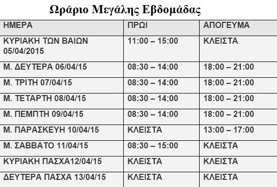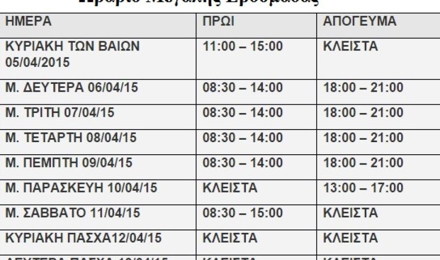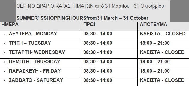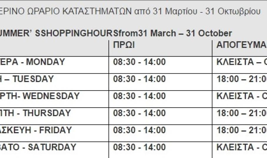 “Σας αποστέλλουμε το ωράριο της Μεγάλης Εβδομάδας και το Θερινό ωράριο καταστημάτων από 31/03/2015 έως 31/10/2015 για ενημέρωσή σας, αναφέρει ο Εμπορικός Σύλλογος Σύρου σε σχετική ανακοίνωσή του, μέσω της οποίας ενημερώνει αναλυτικά τους καταναλωτές.