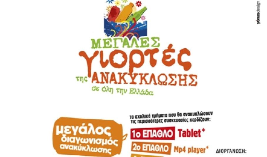 Οι γιορτές θα πραγματοποιηθούν στους Δήμους Αθηναίων και σε 14 ακόμη Δήμους της χώρας (Πειραιά, Νίκαιας- Αγ. Ιωάννου Ρέντη, Αιγάλεω, Αγ. Παρασκευής, Χαλανδρίου, Αμαρουσίου, Κηφισιάς, Αγ. Αναργύρων-Καματερού, Παπάγου-Χολαργού, Ροδίων, Τήνου, Ιωαννιτών, Τρικάλων και Ύδρας. Οι μαθητές, σε συνεργασία με τους Υπευθύνους Περιβαλλοντικ΄γς Εκπαίδευσης ή Σχολικών Δραστηριοτήτων, θα επιστρέφουν για ανακύκλωση μεταλλικές, πλαστικές και γυάλινες συσκευασίες στα Ολοκληρωμένα Κέντρα Ανταποδοτικής που λειτουργούν στους αντίστοιχους Δήμους. Κάθε φορά που θα επιστρέφεται μία συσκευασία, θα εκτυπώνεται αυτόματα κουπόνι συμμετοχής του Μεγάλου Διαγωνισμού Ανακύκλωσης. Τα σχολικά τμήματα που θα συλλέξουν τα περισσότερα κουπόνια θα κερδίσουν μεγάλα δώρα-έπαθλα όπως tablets, MP4 και MP4 players για κάθε μαθητή των πρωτευόντων σχολικών τμημάτων.