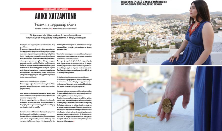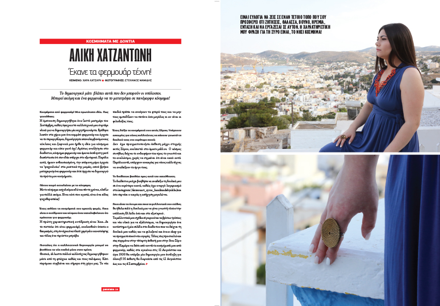 Στην απόφασή της να ασχοληθεί πριν από πέντε χρόνια επαγγελματικά με τη δημιουργία κοσμημάτων από φερμουάρ, αναφέρεται στη συνέντευξή της η πάντα «γλυκύτατη» και σεμνή Αλίκη Χατζαντώνη, η οποία εκτιμά πως η καλλιτεχνική δημιουργία μπορεί να βοηθήσει τα νέα παιδιά στην κρίση. Η ίδια χαρακτηρίζει τη Σύρο «νησί κόσμημα» και σημειώνει πως «είναι ευλογία να ζεις σε έναν τέτοιο τόπο που σου προσφέρει ό,τι ζητήσει, θάλασσα, βουνό, ηρεμία, ένταση και να εργάζεσαι σε αυτόν».