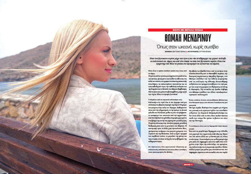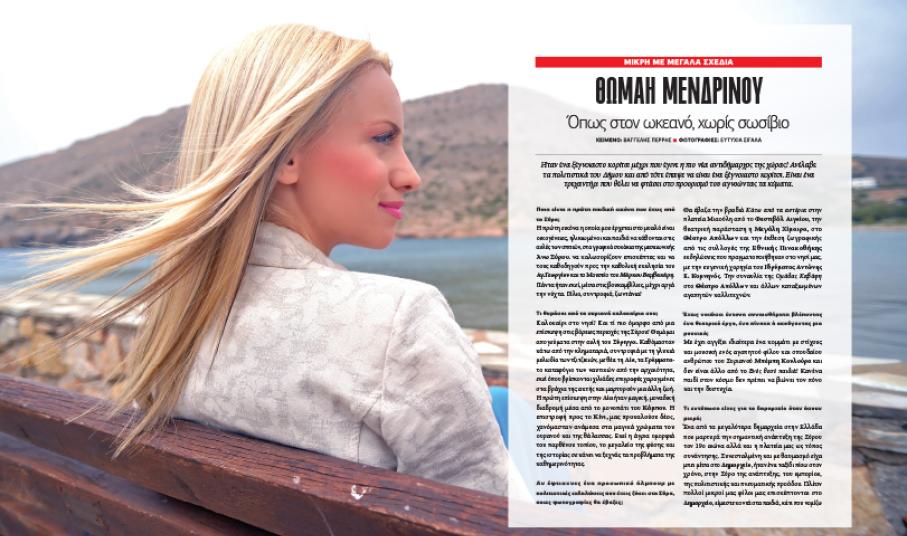 Για τον απαιτητικό στίβο της πολιτικής, η οποία την έριξε κατευθείαν στα βαθιά, παραδίδοντάς της τα σκήπτρα του πολιτισμού αυτού του νησιού, μιλάει η Αντιδήμαρχος Θωμαή Μενδρινού. Μεταξύ άλλων, η κ. Μενδρινού αναφέρεται στις παιδικές αναμνήσεις της από τη γειτονιά της, την Άνω Σύρο αλλά και στις καλοκαιρινές αποδράσεις της σε φανερές και μη «κρυψώνες» του νησιού. «Η πρώτη εικόνα που μου έρχεται στο μυαλό είναι οικογένειες – ηλικιωμένοι και παιδιά- να κάθονται στις αυλές των σπιτιών, στα γραφικά σοκάκια της μεσαιωνικής Άνω Σύρου, να καλωσορίζουν επισκέπτες και να τους καθοδηγούν προς την καθολική εκκλησία του Αγίου Γεωργίου και το Μουσείο του Μάρκου Βαμβακάρη». Για την ίδια δεν υπάρχει τίποτα πιο όμορφο από μία επίσκεψη στις βόρειες περιοχές της Σύρου, εκεί όπου η άγρια ομορφιά του παρθένου τοπίου, το μεγαλείο της φύσης και της ιστορίας σε κάνει να ξεχνάς τα προβλήματα της καθημερινότητας.