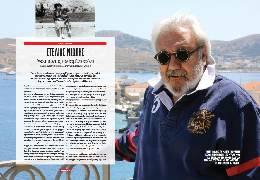 Ο καρδιακός φίλο της Σύρου και ένας από τους τελευταίους μεγάλους τραπεζίτες της ναυτιλίας Στέλιο Νιώτη, εξομολογείται τους λόγους για τους οποίους η πρωτεύουσα των Κυκλάδων αποτελεί την προσωπική του «Ιθάκη». Όπως τονίζει, «Σύρος για τον ίδιο δεν είναι παρά ένα όραμα, μια θεϊκή εμφάνιση σε ορατή μορφή και αντικείμενο ανάμνησης και σκέψης. Κάπου περιπλέκονται οι συνειδητές με τις ασυνείδητες αναμνήσεις, η ηθελημένη με την ακούσια μνήμη αλλά πάλι καταφέρνει κανείς να τα εντάξει όλα συνειδητά στην προσωπική του ιστορία. Είναι το θαύμα της αναλογίας που επιτρέπει να δραπετεύσουμε από το παρόν και να ξαναβρούμε τις παλιές ημέρες, τον χαμένο χρόνο, αυτή είναι η Σύρα».