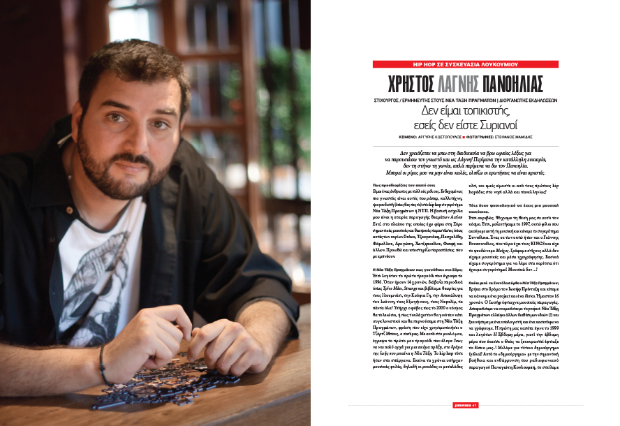 Hip Hop σε συσκευασία λουκουμιού, κερνάει ο ερμηνευτής της Νέας Τάξης Πραγμάτων και διοργανωτής εκδηλώσεων, Χρήστος «Λάγνης» Πανοηλίας. Ο Χρήστος μιλάει για την Εταιρεία Παραγωγής του «Action Εστί» η οποία έχει παρουσιάσει στη Σύρο σημαντικούς καλλιτέχνες όπως ο Μπάμπης Στόκας, ο Μανώλης Φάμελλος, ο Μίλτος Πασχαλίδης και ο Στάθης Δρογώσης, αλλά και για την ιστορία του γκρουπ που ίδρυσαν μαζί με τον ομοϊδεάτη Ιωσήφ Πρίντεζη, στην ηλικία των 16.