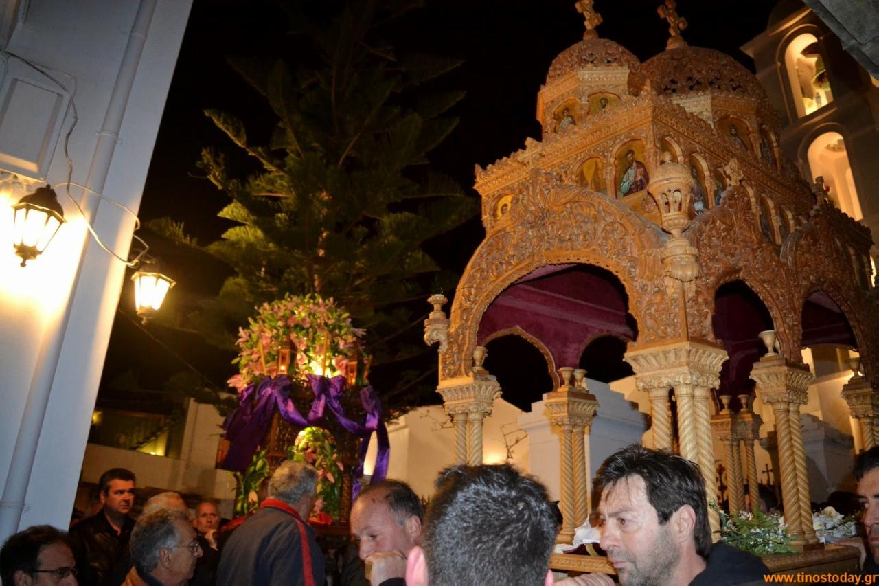 Με ξεχωριστή μεγαλοπρέπεια πραγματοποιήθηκε και η περιφορά των Επιταφίων στην πόλη της Τήνου. Οι Ενορίες της Χώρας, ακολουθώντας η καθεμία τη δική της διαδρομή, συγκεντρώθηκαν στην πλατεία Παντανάσσης. Από τους πιο εντυπωσιακούς Επιταφίους στη Τήνο αλλά και γενικότερα στην Ελλάδα θεωρείται αυτός της ενορίας του Αγίου Νικολάου, ο oποίος ακολουθεί την δική του πορεία προς τη θάλασσα συνοδεία πιστών ενοριτών αλλά και επισκεπτών. Εντός της θαλάσσης τελέστηκε επιμνημόσυνη δέηση υπέρ αναπαύσεως όλων των ναυτικών που χάθηκαν άδικα στην άβυσσο των θαλασσών και των ωκεανών.