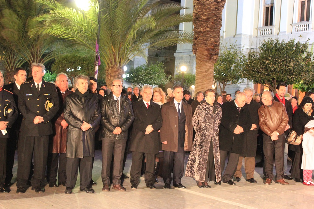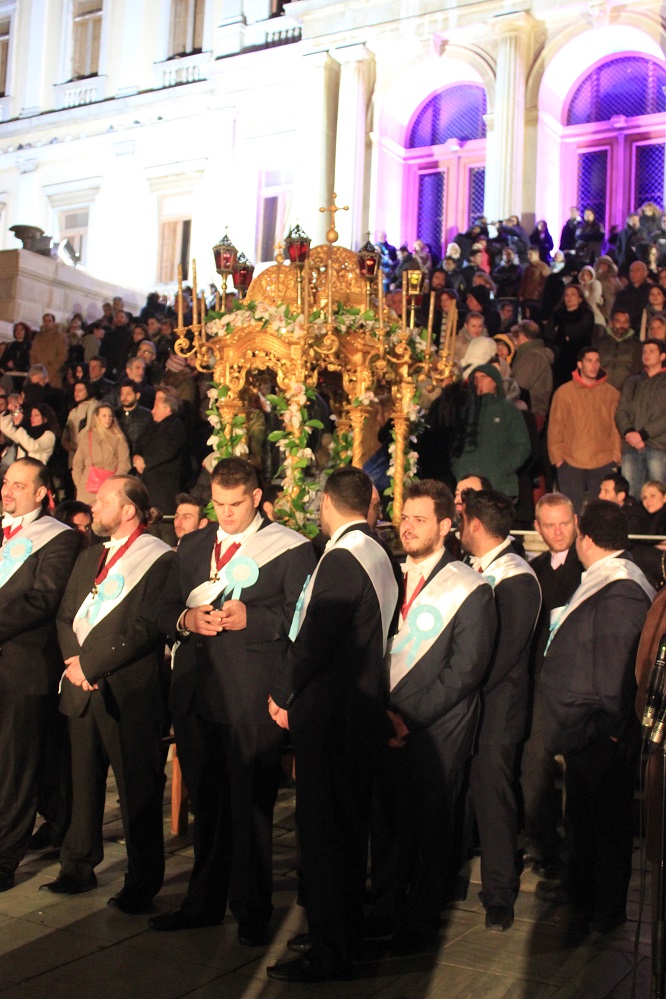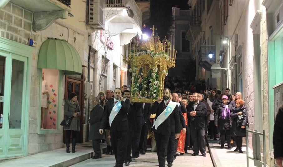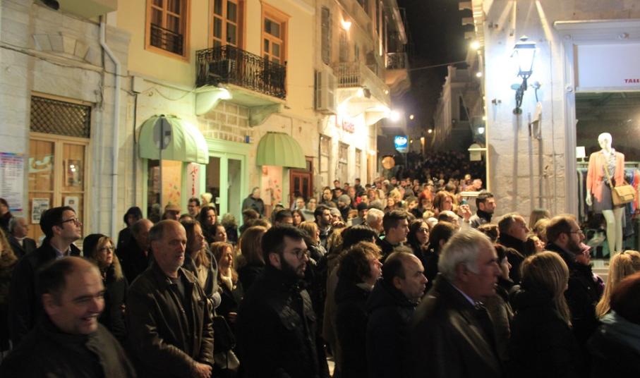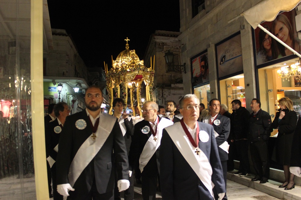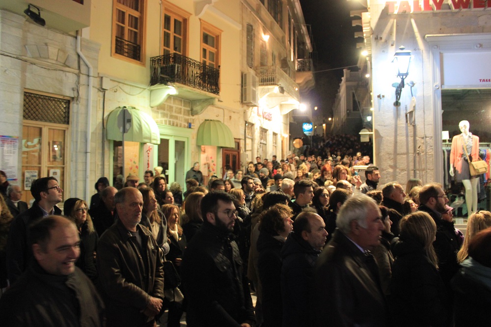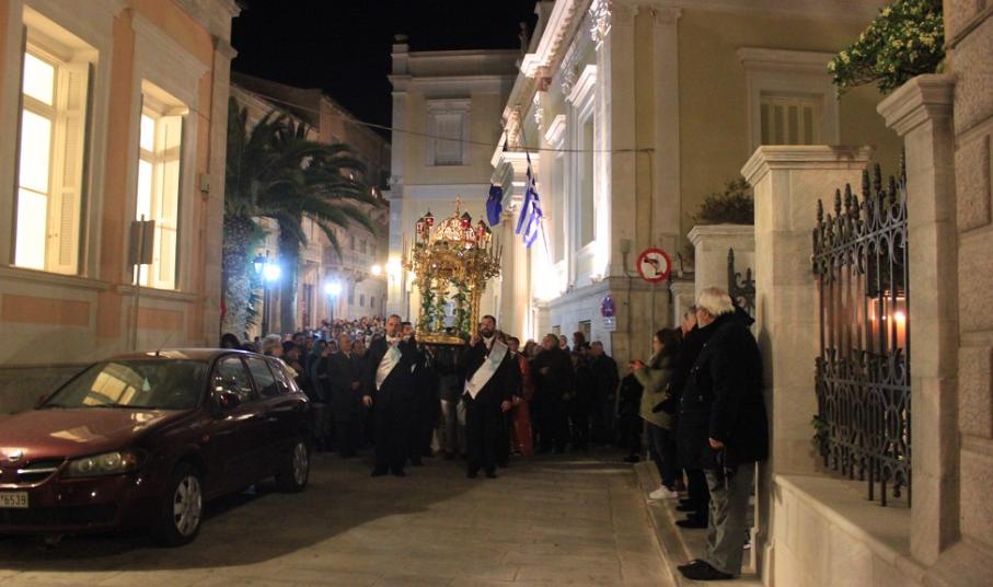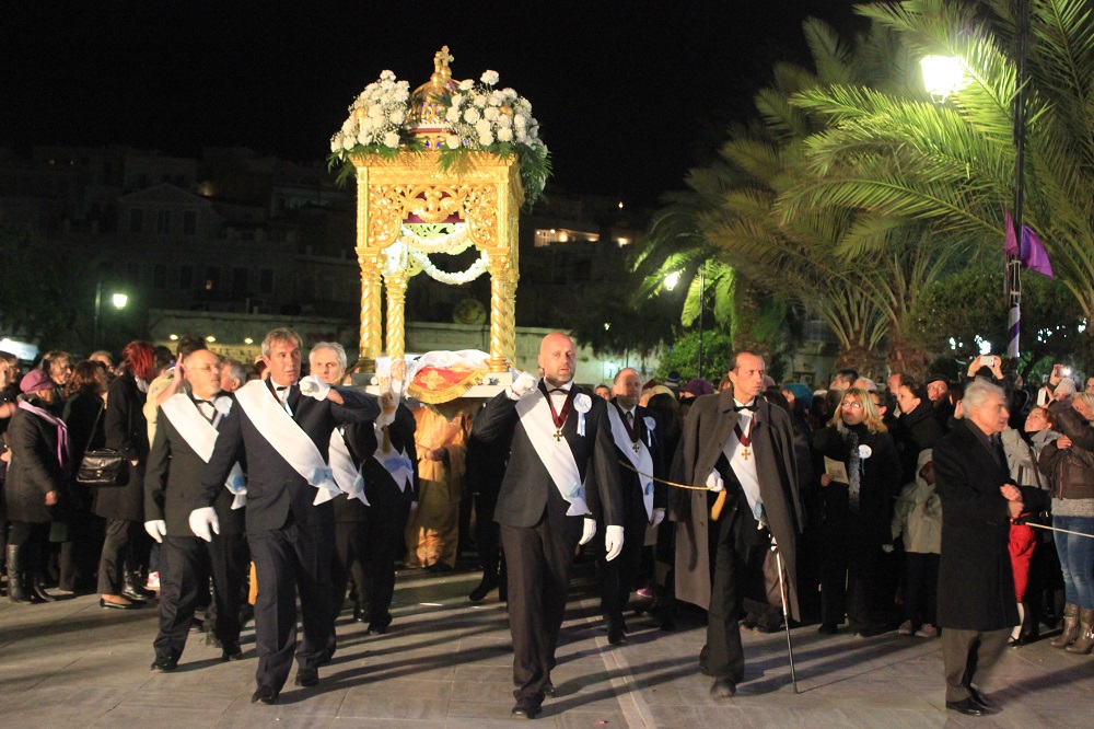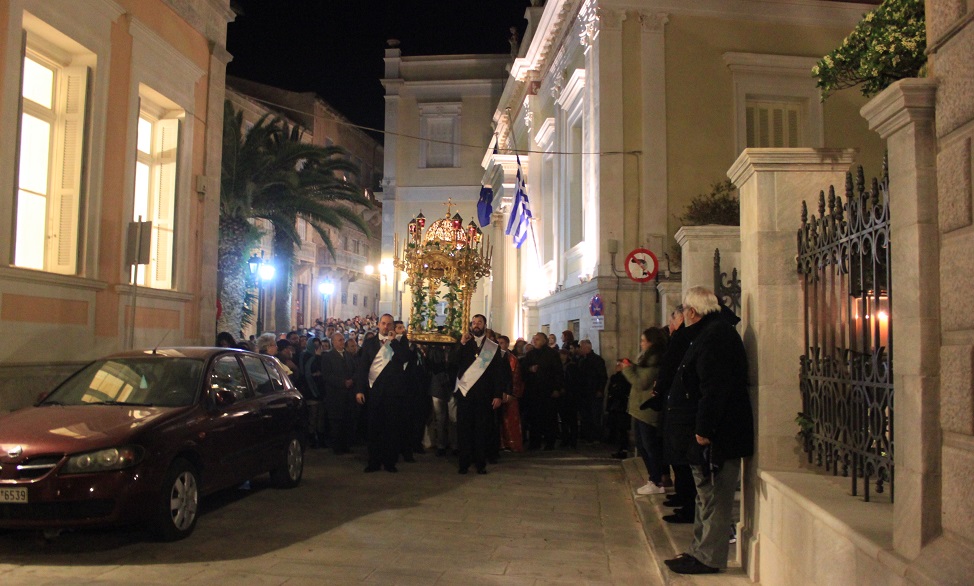 Μοναδικές εικόνες θρησκευτικής μεγαλοσύνης αντίκρισαν οι πιστοί και φέτος, κατά τη διάρκεια της περιφοράς των Επιταφίων των Ιερών Ναών της Ερμούπολης, με την καθιερωμένη συνάντησή τους στην πλατεία Μιαούλη να κερδίζει τα βλέμματα όλων. Παρά το κρύο, ο κόσμος ακολούθησε τις πομπές των Ιερών Ναών Μεταμόρφωσης του Σωτήρος, Αγίου Νικολάου και Κοιμήσεως της Θεοτόκου σε όλες τις οδούς της Ερμούπολης, από όπου και διήλθαν οι Επιτάφιοι, φθάνοντας μπροστά από το Δημαρχιακό Μέγαρο. Εκεί, αναπέμφθηκε δέηση και εκφωνήθηκε ομιλία από τον κκ. Δωρόθεο Β΄, ενώ εγκώμια έψαλε η χορωδία του Ιερού Ναού του Αγίου Νικολάου. Την περιφορά του Επιταφίου από τον Μητροπολιτικό Ναό έως και την πλατεία, πλαισίωσε και η Δημοτική Φιλαρμονική προσδίδοντας ακόμη μεγαλύτερη λαμπρότητα. Από κατοικίες φωτισμένες οι πιστοί σε κάθε γωνιά της πόλης, έραναν με ροδοπέταλα τους Επιτάφιους, εκφράζοντας τη βαθιά πίστη τους το βράδυ της Μεγάλης Παρασκευής, της πιο θλιβερής ημέρας τους χρόνου.