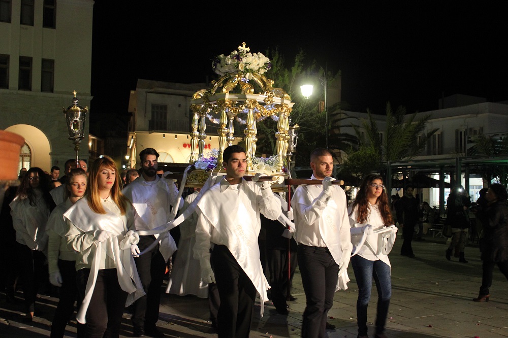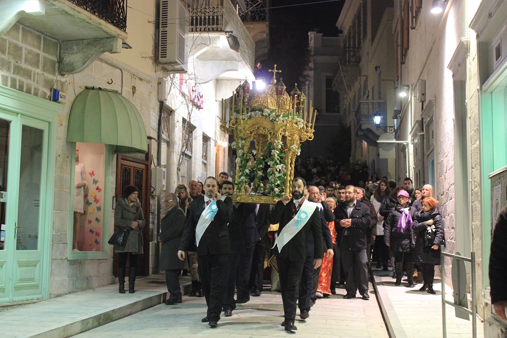Ιδιαίτερη λαμπρότητα χαρακτήρισε και την περιφορά του Επιταφίου των Καθολικών, από τον οποίο “σκόρπισε” ευλογία στο ιστορικό κέντρο της πόλης, με τους πιστούς να συνοδεύουν, κρατώντας κεριά και ψάλλοντας το “Ω γλυκύ μου έαρ”.