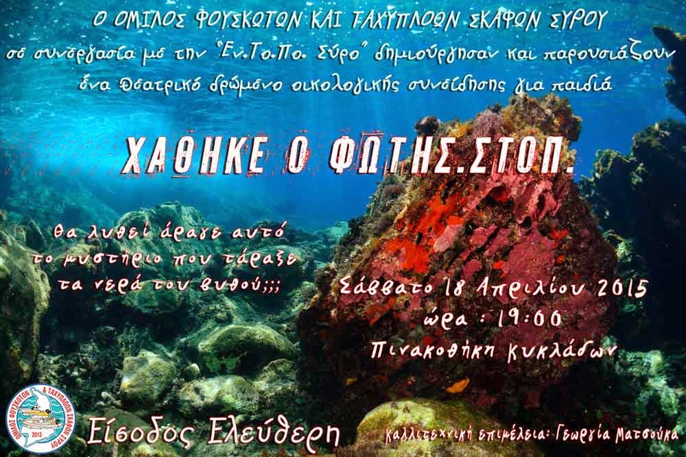 Ο Όμιλος Φουσκωτών και Ταχυπλόων Σκαφών Σύρου (ΟΦΤΣΣ), σε συνεργασία με την ΕνΤοΠο Σύρο παρουσιάζει το Σάββατο 18 Απριλίου 2015 στις 19.00 το διαδραστικό θεατρικό δρώμενο “Χάθηκε ο Φώτης. ΣΤΟΠ.” για παιδιά όλων των ηλικιών, με θέμα την οικολογική μας συνείδηση, στην Πινακοθήκη Κυκλάδων.