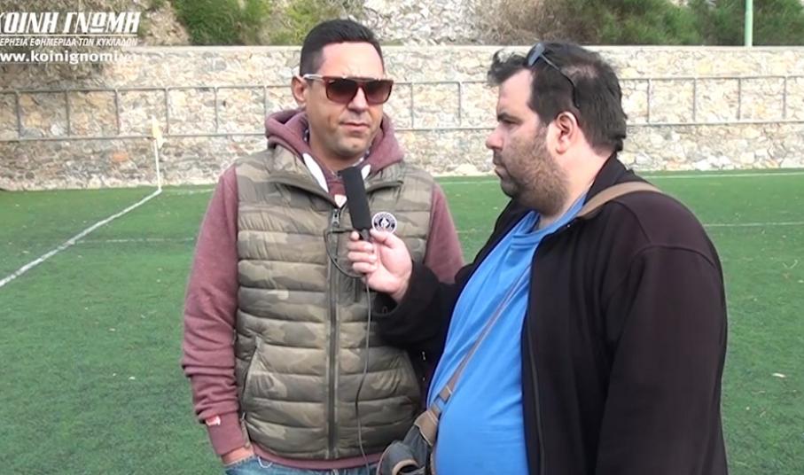 "Η ομάδα έκανε μία καταπληκτική πορεία, καθώς μην ξεχνάμε πως στο ξεκίνημα της σεζόν πολλοί πίστευαν ότι δεν θα πάμε ούτε στα μπαράζ του πρωταθλήματος. Κανείς δεν μας υπολόγιζε και πολλοί μας είχαν υποτιμήσει. Τελικά όμως μετά τις προσπάθειες των παικτών, του προπονητή μας και τη διοίκησης, τα καταφέραμε και πλέον είμαστε στις τέσσερις καλύτερες ομάδες του πρωταθλήματος. Η ομάδα μου δεν φοβάται κανέναν αντίπαλο, οι άλλοι μας φοβούνται. Από εδώ και πέρα είναι δύο παιχνίδια και όλα θα εξαρτηθούν από την ημέρα που θα βρεθούν οι παίκτες. Οι ομάδες είναι ισοδύναμες και είναι οι πιο οργανωμένες διοικήσεις. Αυτή τη στιγμή οι τρεις πιο βαριές φανέλες των Κυκλάδων θα παίξουν για το πρωτάθλημα. Πολλοί θεωρούν τον Πανθηραϊκό, από την πλευρά μου δεν πιστεύω ότι είναι, γιατί εγώ πιστεύω ότι φαβορί είναι ο Α.Ο. Σύρου με τον Α.Ο. Μυκόνου και αυτές οι δύο ομάδες θα φτάσουν στον τελικό".
