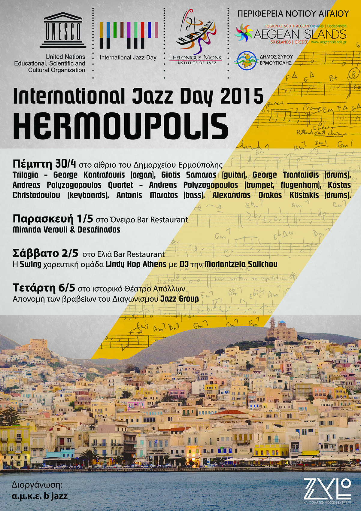 Η International Jazz Day στη Σύρο, που διοργανώνεται από την Α.Μ.Κ.Ε. b jazz, τελεί υπό την αιγίδα της Unesco και της Περιφέρειας Ν. Αιγαίου και υποστηρίζεται από το Δήμο Ερμούπολης.