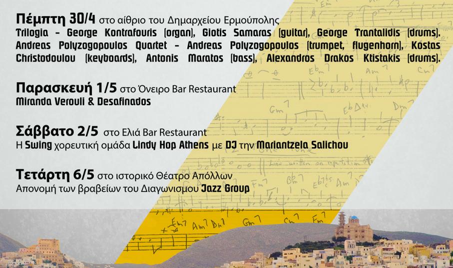 Το πρόγραμμα των φετινών εκδηλώσεων στην Ερμούπολη ανοίγουν δύο συναυλίες στο αίθριο του Δημαρχείου Ερμούπολης την Πέμπτη 30 Απριλίου 2015. Ειδικότερα, το κοινό του νησιού θα έχει την ευκαιρία να απολαύσει τους Trilogia (Γιώργος Κοντραφούρης – organ, Γιώτης Σαμαράς – κιθάρα και Γιώργος Τρανταλίδης – τύμπανα), καθώς και τους Andreas Polyzogopoulos Quartet (Αντρέας Πολυζωγόπουλος – τρομπέτα, flugenhorn, Κωστής Χριστοδούλου - πλήκτρα, Αντώνης Μαράτος - μπάσσο, Αλέξανδρος-Δράκος Κτιστάκης – τύμπανα).