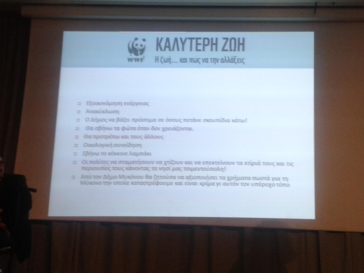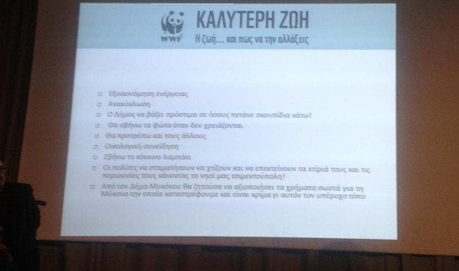Ομιλητές της ημερίδας ήταν ο αντιπρόεδρος της ΚΔΕΠΠΑΜ Βαγγέλης Πελέκης, η Βιολόγος Μαρία Σπαρτινού, υπεύθυνη σχολικών δραστηριοτήτων Δ.Δ.Ε. Κυκλάδων, η Ελένη Σβορώνου, υπεύθυνη Περιβαλλοντικής Εκπαίδευσης WWF Ελλάς και ο Δημήτρης Καλφάκης, μέλος του Διοικητικού Συμβουλίου του “ΜΟΙΚΟΝΟΣ”, αστικού συνεταιρισμού για την ανακύκλωση στη Μύκονο.