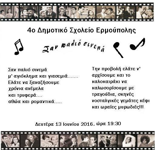 Μαθητές και εκπαιδευτικοί του 4ου Δημοτικού Σχολείου μας καλούν να αποχαιρετίσουμε όλοι μαζί τη σχολική χρονιά που φτάνει στο τέλος της, ξαναζώντας χρόνια ανέμελα και τρυφερά, αθώα και ρομαντικά, σαν παλιό σινεμά μ’ αγιόκλημα και γιασεμιά.