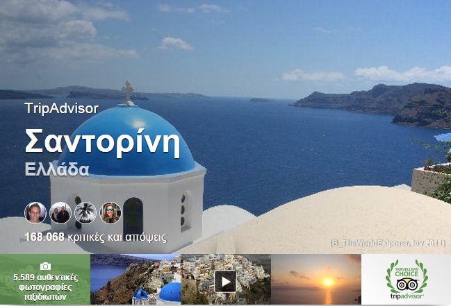 Το απέραντο γαλάζιο και η μοναδική ομορφιά του νησιώτικου τοπίου των Κυκλάδων που αποτυπώνεται στη Σαντορίνη απέσπασε την πρωτιά στη λίστα με τις τουριστικές προτιμήσεις των εκατομμυρίων χρηστών του Trip Advisor για το 2015.