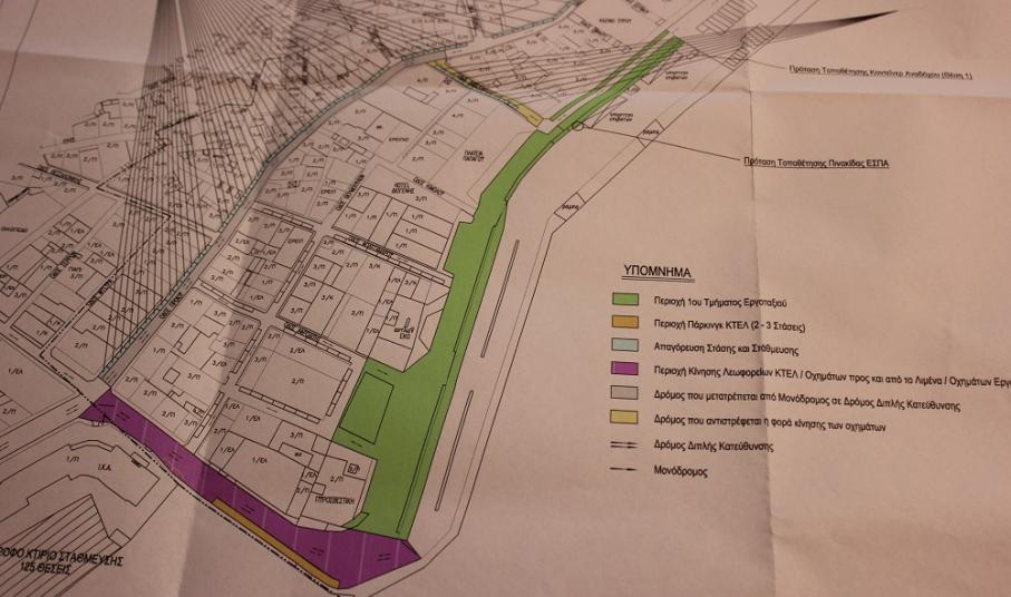 Επιπλέον, έχει προβλεφθεί η μονοδρόμηση της παραλιακής οδού από τη διασταύρωση με την οδό Δωδεκανήσου έως και την οδό Ελευθερίου Βενιζέλου (με την ανωτέρω κατεύθυνση), αλλά και η δημιουργία προσωρινών στάσεων των λεωφορείων της αστικής συγκοινωνίας επί της οδού Σταματίου Πρωίου και συγκεκριμένα μπροστά στο κατάστημα Παυλίδη, στον Ιερό Ναό Κοιμήσεως και στο φαρμακείο Αρμακόλα. Πέραν αυτών, θα υπάρχει μέριμνα και η διέλευση των οχημάτων από την οδό Αλ. Παναγούλη θα γίνεται μόνο για την είσοδο και έξοδο από τον λιμένα.