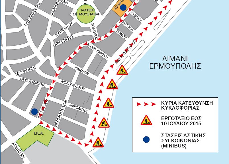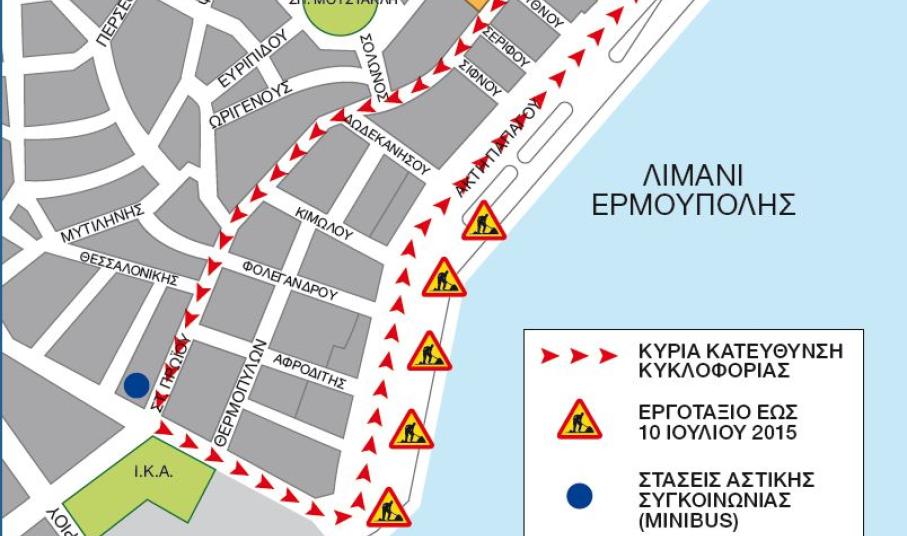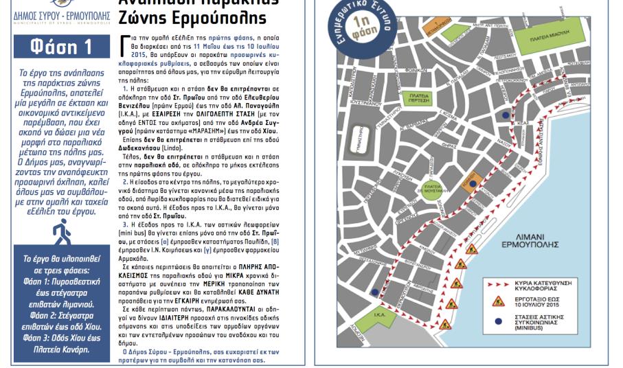 Το σύνολο των αλλαγών που θα ισχύσουν στην κυκλοφοριακή ροή περιλαμβάνεται στο σχετικό ενημερωτικό έντυπο που διένειμαν το πρωί του Σαββάτου στις καφετέριες της παραλιακής ζώνης ο δήμαρχος, Γιώργος Μαραγκός από κοινού με άλλα μέλη της Δημοτικής Αρχής και του Δημοτικού Λιμενικού Ταμείου Σύρου, προκειμένου να πληροφορηθούν οι δημότες του νησιού για τα μέτρα που θα ισχύσουν στην Α΄ Φάση υλοποίησης του έργου.