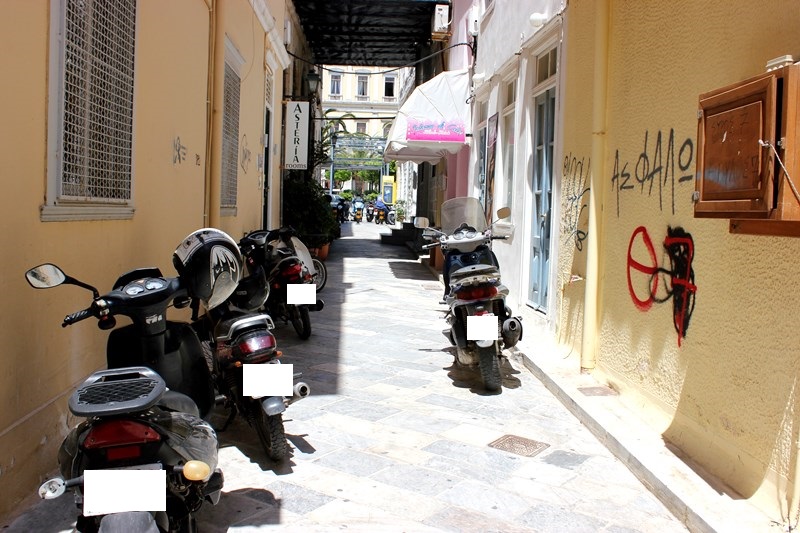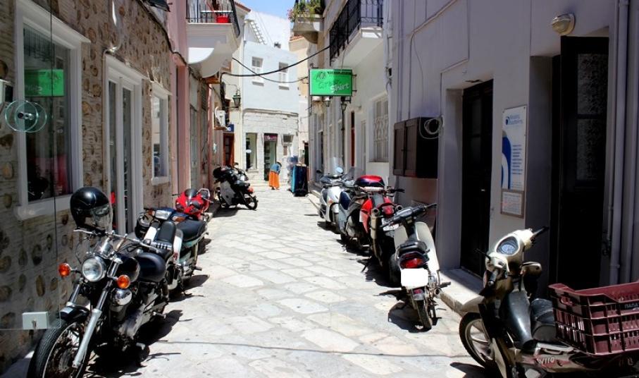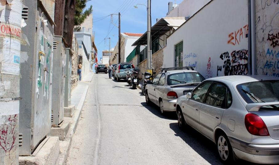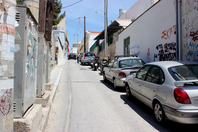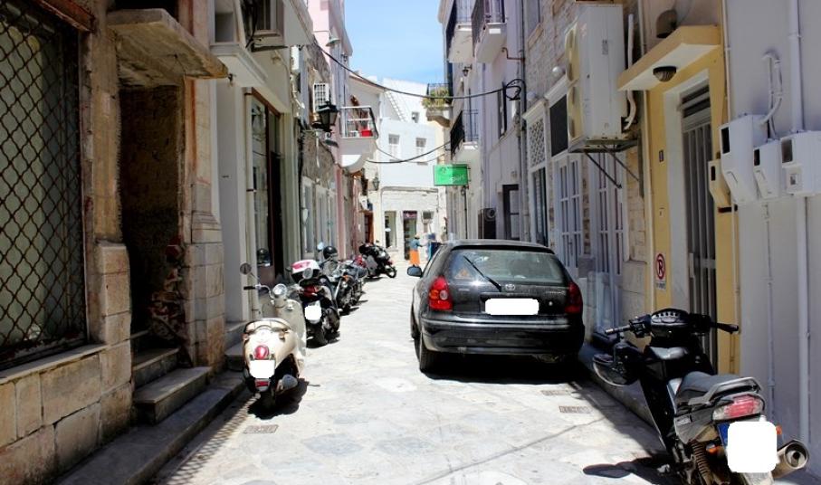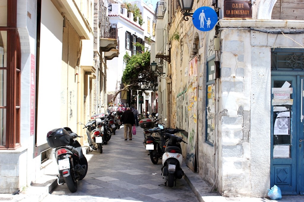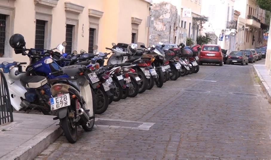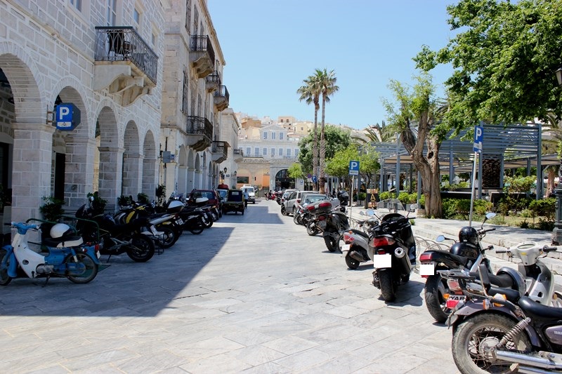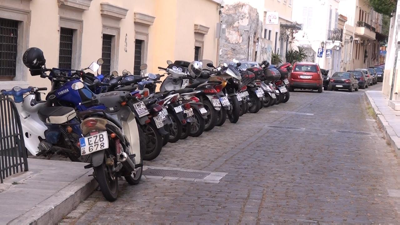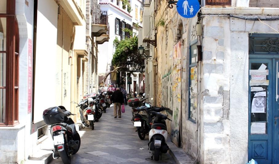 Όπως φαίνεται και από το φωτογραφικό υλικό, το οποίο συγκεντρώθηκε κατά τη διάρκεια του οδοιπορικού, εκατοντάδες δίκυκλα βρίσκονται σταθμευμένα, σε καθημερινή βάση, σε όλα ανεξαιρέτως τα πεζοδρομημένα γραφικά στενά δρομάκια της Ερμούπολης. Η κατάσταση επιδεινώνεται, με τα τετράτροχα οχήματα να καθιστούν τη διάβαση των πεζών ιδιαίτερα δύσκολη υπόθεση, καθώς καταλαμβάνουν τον μεγαλύτερο χώρο των δρομίσκων, αφήνοντας ελάχιστο περιθώριο.
