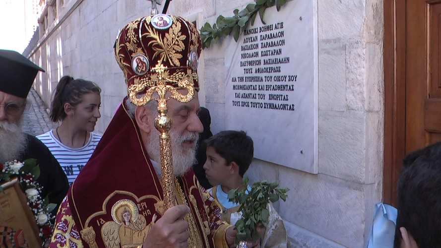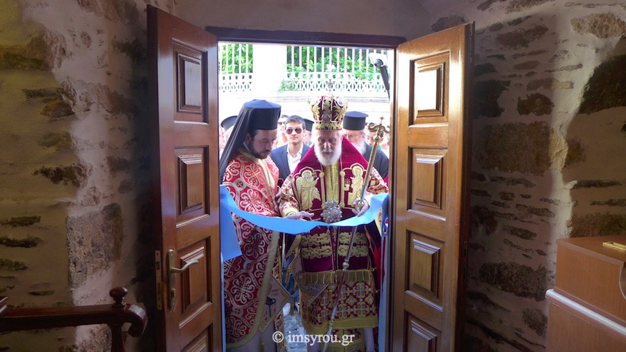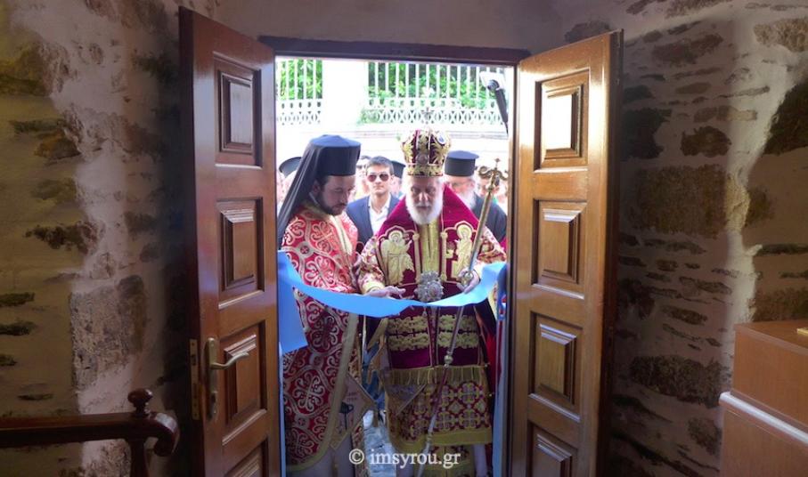 Τα εγκαίνια πραγματοποιήθηκαν μετά το πέρας της Πανηγυρικής Θείας Λειτουργίας στον Ιερό Ναό του πολιούχου της Σύρου, όπου εκτέθηκαν προς προσκύνημα η ιερά Εικόνα του Αγίου Δημητρίου και η Τιμία Χειρ του Αγίου Παντελεήμονα.