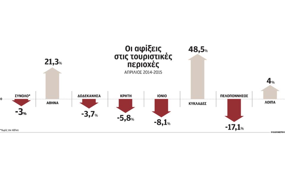 Και όλα αυτά, ενώ η τουριστική χρονιά ξεκίνησε έντονα ανοδικά, ειδικά στο α΄ τρίμηνο, χάρις στη μεγάλη αύξηση των αφίξεων ξένων επισκεπτών στην Αθήνα. Αντίθετα, σε αρκετές τουριστικές περιοχές όπως στην Κω, στο Ηράκλειο, στα Χανιά στην Κέρκυρα, στη Ζάκυνθο, στην Κεφαλονιά, στη Μύκονο και στη Μυτιλήνη, ο αριθμός των αεροπορικών αφίξεων από το εξωτερικό τον Απρίλιο, πρώτο μήνα της σεζόν, κινήθηκε σε χαμηλότερα επίπεδα σε σχέση με το ίδιο διάστημα πέρυσι.