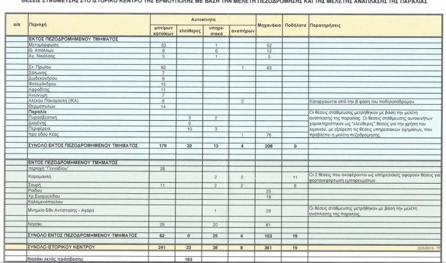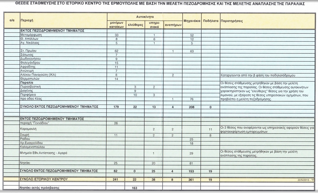 Ανεπαρκείς θέσεις στάθμευσης σύμφωνα με τα στοιχεία που προσκόμισαν οι ίδιοι, αλλά και ανάγκη καθορισμού ζωνών προκειμένου να εξυπηρετούνται απρόσκοπτα οι πολίτες του κέντρου και να μην προκαλείται μεγαλύτερη συμφόρηση αποτέλεσαν τα βασικά θέματα – εκ μέρους τους - κατά τη διάρκεια της έγκρισης της τροποποίησης της μελέτης “Επικαιροποίηση κυκλοφοριακής μελέτης ιστορικού κέντρου Ερμούπολης” και των προσωρινών κυκλοφοριακών ρυθμίσεων της θερινής περιόδου.
