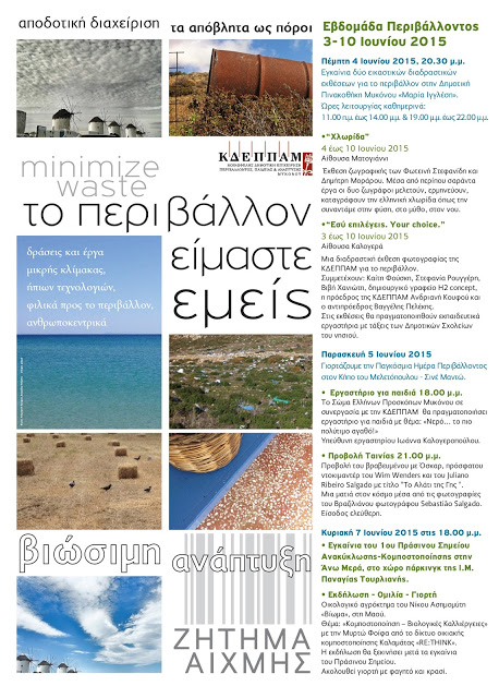 Κοινωνικές και καλλιτεχνικές δράσεις με στόχο την ενημέρωση και την ευαισθητοποίηση του κοινού για τις σημαντικές περιβαλλοντικές αξίες και την ανάγκη διατήρησής τους, διοργανώνει η Κοινωφελής Δημοτική Επιχείρηση Παιδείας, Περιβάλλοντος και Ανάπτυξης Μυκόνου, ενόψει της Παγκόσμιας Ημέρας Περιβάλλοντος.