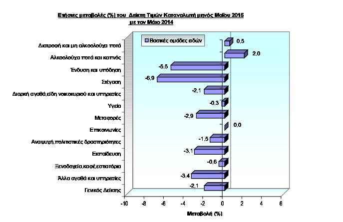 Από τη σύγκριση του Γενικού Δείκτη Τιμών Καταναλωτή του μηνός Μαΐου 2015, προς τον αντίστοιχο Δείκτη του Μαΐου 2014, προκύπτει μείωση 2,1%, έναντι μείωσης 2,0%, που σημειώθηκε κατά την ίδια σύγκριση του έτους 2014 προς το 2013.