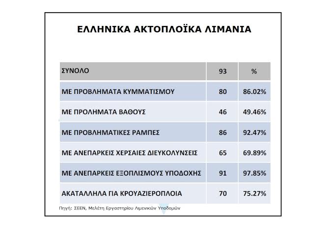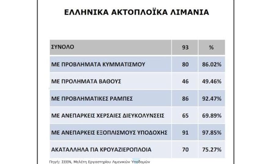 Σύμφωνα με μελέτη του Εργαστηρίου Λιμενικών Υποδομών, από τα 93 ακτοπλοϊκά λιμάνια της χώρας, τα 70 (ποσοστό 75,27%) είναι ακατάλληλα για κρουαζιερόπλοια, το 80 (86,02%) αντιμετωπίζουν προβλήματα κυματισμού, τα 46 (49,46%) έχουν προβλήματα βάθους, τα 86 (92,47%) έχουν προβληματικές ράμπες, τα 65 (69,89%) έχουν ανεπαρκείς χερσαίες διευκολύνσεις ενώ σχεδόν όλα, με εξαίρεση μόλις δύο, διαθέτουν ανεπαρκείς εξοπλισμούς υποδοχής.