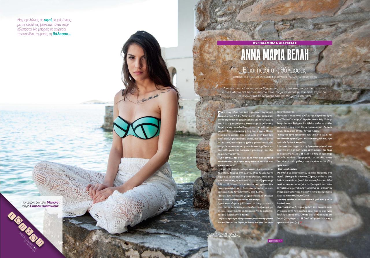 Η πάντα χαμογελαστή παρουσιάστρια ποζάρει με στυλ στον μεσαιωνικό οικισμό της Άνω Σύρου και περιγράφει μία μοναδική ανατολή που έζησε στο νησί. «Θυμάμαι σε ένα ταξίδι με την αδερφή μου, είχε τύχει να ξυπνήσω πάρα πολύ νωρίς, γύρω στις 6 το πρωί, μόλις ξημέρωνε. Βγήκα έξω να δω την ανατολή. Εκείνες τις στιγμές, ατενίζοντας το απέραντο γαλάζιο, το μεγαλείο της φύσης, αισθανόμουν πως είχα εναρμονιστεί, είχα γίνει ένα με το περιβάλλον. Ένιωθα ότι το νησί είναι δικό μου κι εγώ ήμουν δική του. Ήταν κάτι μοναδικό, μια στιγμή που νιώθεις γαλήνη και γεμίζεις ενέργεια».