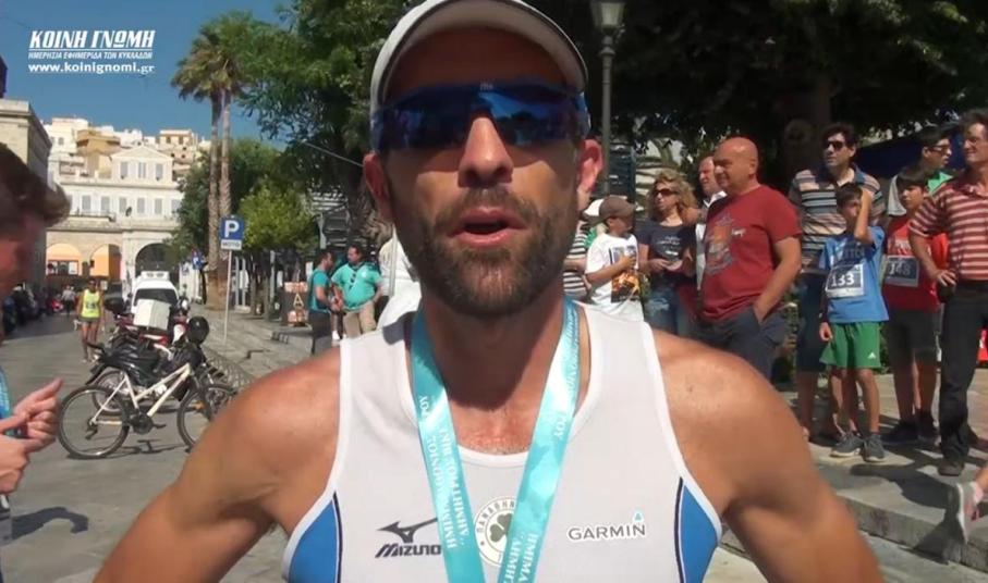 "Ο αγώνας διεξήχθη σε ικανοποιητικά επίπεδα, έχει έρθει κόσμος από όλη την Ελλάδα, όπως είπε και προηγουμένως ο κ. Δήμαρχος και είμαστε πάρα πολύ ευχαριστημένοι. Ο αγώνας ανακοινώθηκε πριν από δύο μήνες και δεν είχαμε αρκετό χρόνο στη διάθεσή μας, δουλέψαμε πάρα πολύ, σε συνεργασία και με την εταιρία, τους δρομείς της Σύρου που κι εκείνοι με τη σειρά τους μας βοήθησαν αρκετά και θέλω να τους ευχαριστήσω γι' αυτήν τους την συνεισφορά. Επίσης είναι ένας αγώνας ο οποίος έχει πάρα πολλούς χορηγούς, η Συριανή κοινωνία έχει λάβει το μήνυμα και βοηθά. Όπως επίσης και οι εθελοντές οι οποίοι είναι δίπλα μας και μας στηρίζουν σε αυτήν την προσπάθεια".