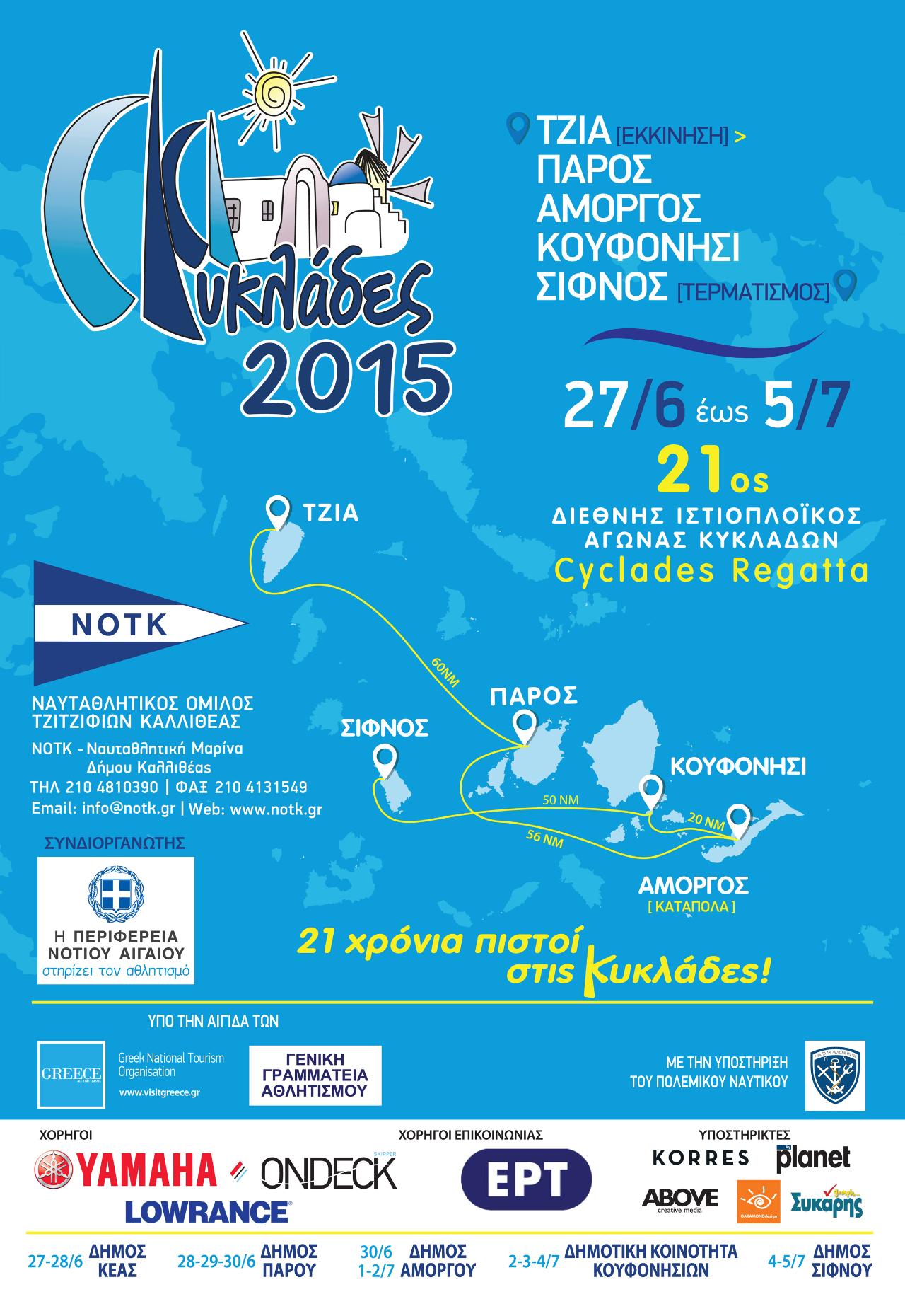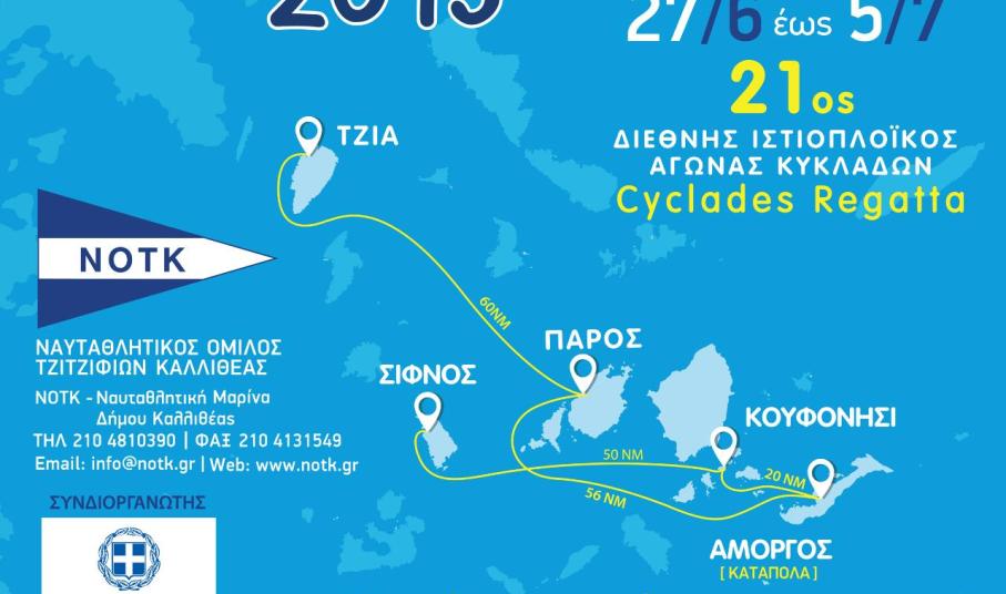 Ο 21ος Διεθνής Ιστιοπλοϊκός Αγώνας “CYCLADES REGATTA 2015” του ΝΟΤΚ καινοτομεί φέτος! Εκκινεί από την Τζιά και τερματίζει στη Σίφνο, αυξάνοντας τα νησιά-σταθμούς που παραδοσιακά επισκέπτεται το Cyclades Regatta από 3 σε 5.Τα ελληνικά και αλλοδαπά σκάφη με τα πληρώματά τους των κατηγοριών (ORCi, ORC Club, ORC ClubNonSpinnaker και IRC), θα εκκινήσουν από την Τζιά, θα πλεύσουν προς Πάρο, Αμοργό, Κουφονήσι και θα τερματίσουν στην Σίφνο.