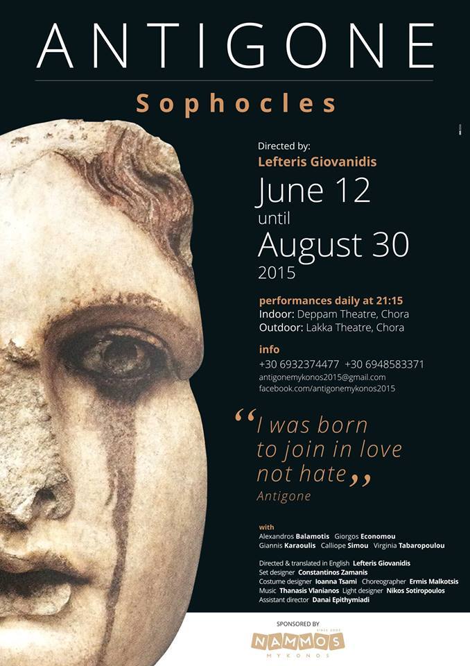 Μια πρωτοβουλία που τιμά τη Μύκονο και τον πολιτισμό της. Η επίσημη πρεμιέρα της “Αντιγόνης” θα πραγματοποιηθεί το Σάββατο 20 Ιουνίου 2015.