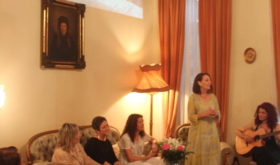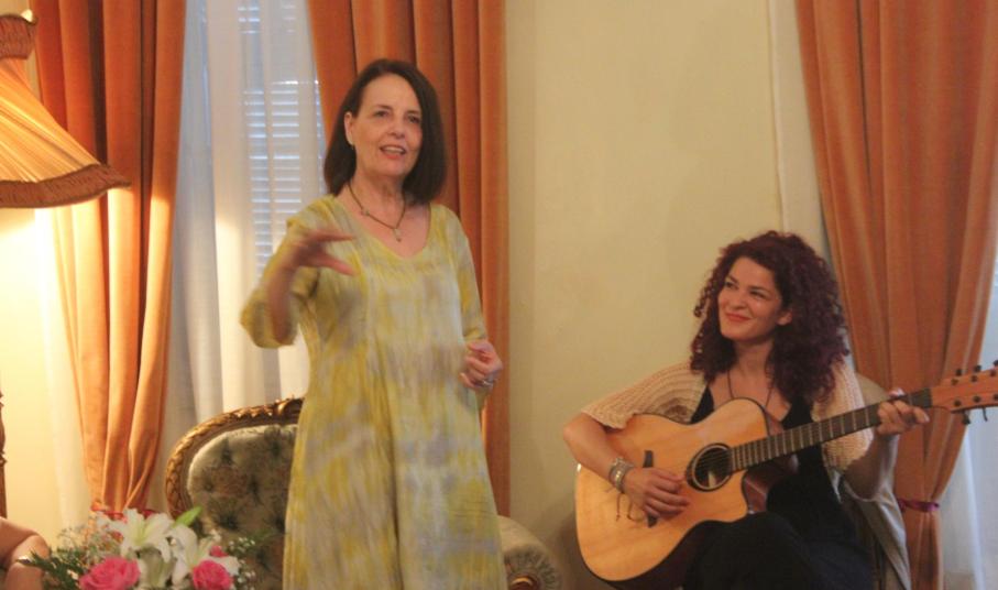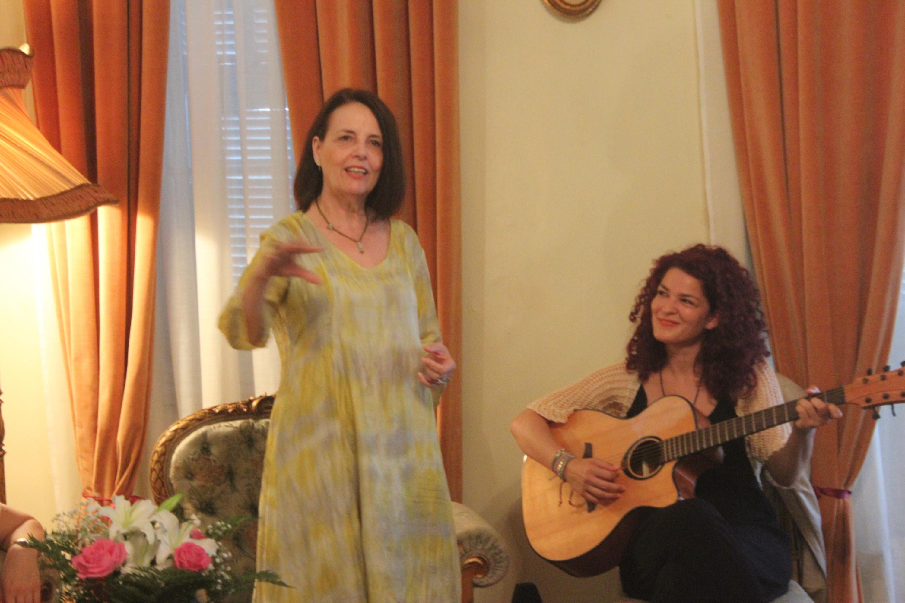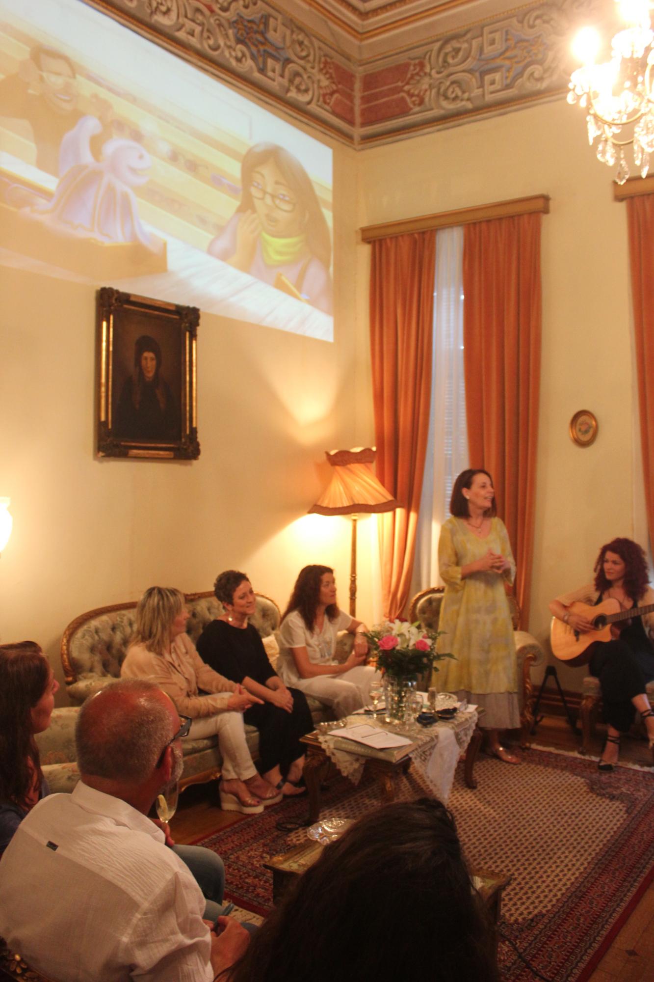 Στη συνέχεια, το κοινό είχε τη χαρά να ακούσει την ιστορία του μαντιλιού από την κ. Θάνου, συνοδεία κιθάρας. Η Ελπίδα Γαδ, με τη μοναδική φωνή της ερμήνευσε το τραγούδι που γράφτηκε για το βιβλίο από τον μουσικό Αντρέα Γκούβα.