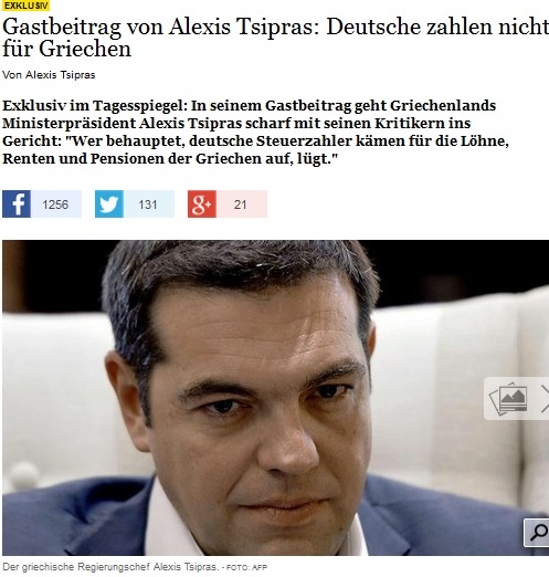 Απευθυνόμενος στους Γερμανούς πολίτες σχετικά με το κόστος που αυτοί επωμίζονται για την οικονομική κατάσταση της Ελλάδας, ο πρωθυπουργός, Αλέξης Τσίπρας, με άρθρο του στο γερμανικό Tagesspiegel, αποδίδει ουσιαστικά την πραγματικότητα όσον αφορά επικοινωνιακή μεθόδευση των σχετικών δηλώσεων των ξένων αξιωματούχων, μέσω των οποίων επιχειρείται «συσκότιση της πραγματικότητας».