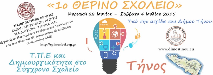 Το Παιδαγωγικό Τμήμα Δ.Ε. και το Εργαστήριο Προηγμένων Μαθησιακών Τεχνολογιών στη Δια Βίου και Εξ' Αποστάσεως Εκπαίδευση του Πανεπιστημίου Κρήτης, διοργανώνουν στην Τήνο το “1ο Θερινό Σχολείο” με θέμα: “Νέες Τεχνολογίες και Δημιουργικότητα: από τη θεωρία στην πράξη” .