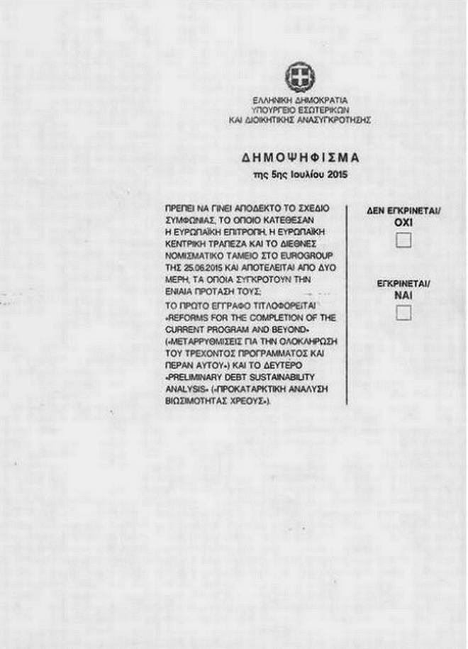 Αναφορικά με την ύπαρξη ενός μόνο ψηφοδελτίου, το υπουργείο απαντά, ότι η μορφή και το περιεχόμενό του, καθορίζονται από τον εφαρμοστικό νόμο του Συντάγματος 4023/2011. Σύμφωνα με το άρθρο 13, «1. Το εκλογικό σώμα εκφράζει την προτίμησή του σε έντυπο ψηφοδέλτιο με τη χρήση των όρων ΝΑΙ και ΟΧΙ, ή με οποιονδήποτε άλλο τρόπο καθορίζει η Ολομέλεια της Βουλής στην απόφασή της για τη διενέργεια δημοψηφίσματος. 2. Στους ψηφοφόρους μαζί με το έντυπο χορηγείται και ένα λευκό ψηφοδέλτιο».