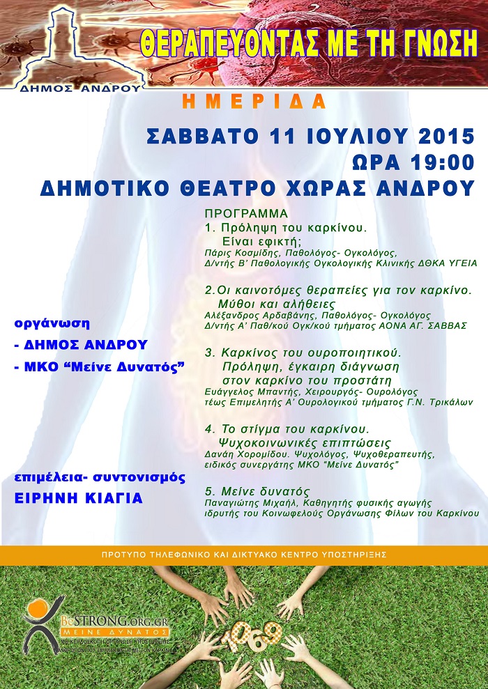 Ο Δήμος Άνδρου και η Κοινωφελής Μη Κερδοσκοπική Οργάνωση «Μείνε Δυνατός» προσκαλούν τις Ανδριώτισσες και τους Ανδριώτες στην ημερίδα με τίτλο «Θεραπεύοντας με την γνώση», η οποία έχει ως θέμα την πρόληψη και θεραπεία του καρκίνου.