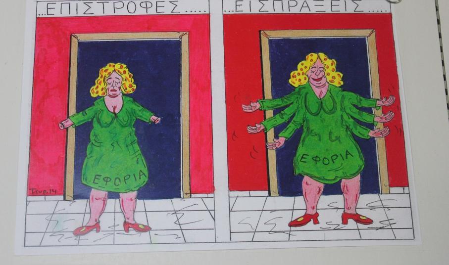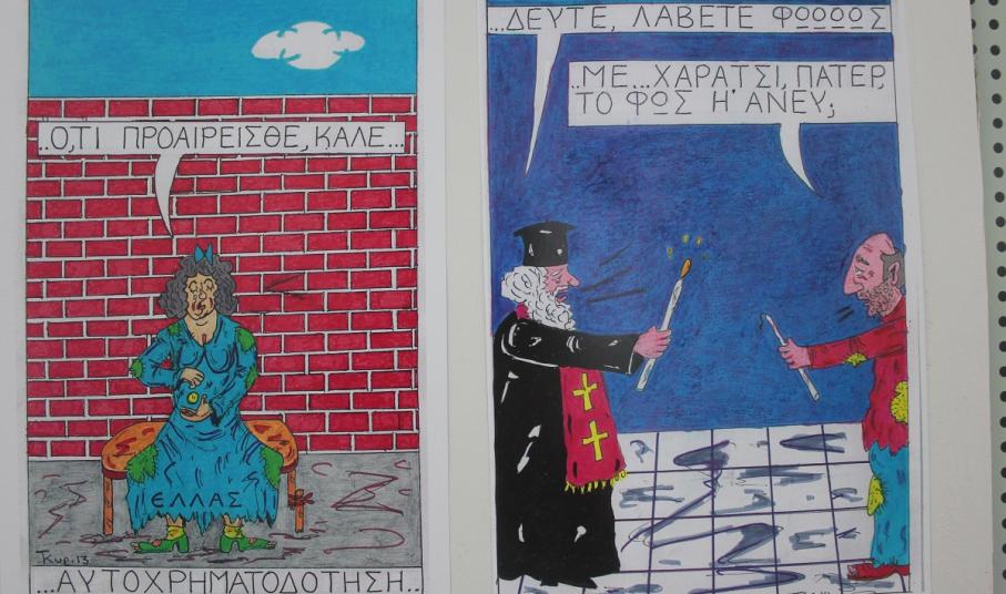 Επίκαιρα σκίτσα, εμπνευσμένα από την πολιτική επικαιρότητα και τις κοινωνικές επιπτώσεις λανθασμένων επιλογών, που απειλούν να υποθηκεύσουν το μέλλον της νέας γενιάς της χώρας μας, έχουν την ευκαιρία να απολαύσουν τόσο οι κάτοικοι, όσο και οι επισκέπτες της Σύρου έως το τέλος Ιουλίου.
