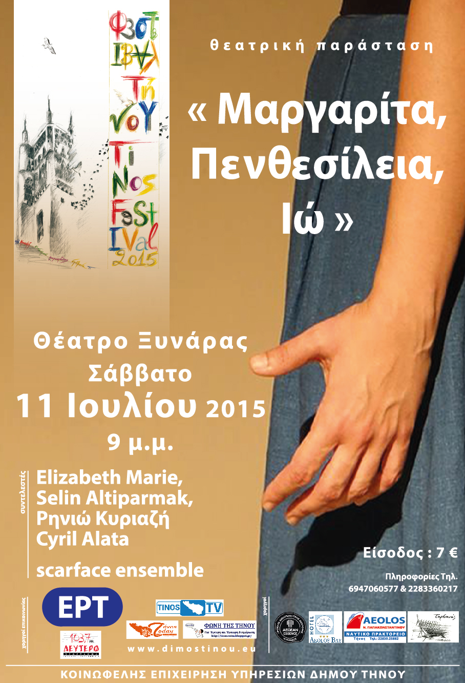 Μετά το θεατρικό αναλόγιο “Μαργαρίτα, Πενθεσίλεια, Ιώ” (ΚΕΤ, Οκτ. 2014), η παράσταση που δημιουργήθηκε από το πολυπολιτισμικό work in progress και τη συνάντηση της Γαλλίδας Élisabeth Marie με τις ηθοποιούς Ρηνιώ Κυριαζή (Ελλάδα) και Selin Altiparmak (Τουρκία) παρουσιάζεται στις 11 Ιουλίου 2015 στο Θέατρο Ξινάρας, στο πλαίσιο του Φεστιβάλ Τήνου 2015.